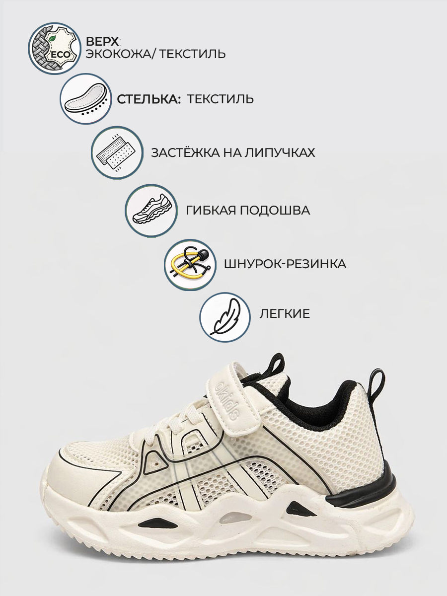 Верх выполнен из сочетания экокожи и текстиля — материалы обеспечивают износостойкость и хорошую вентиляцию. Текстильная подкладка и стелька мягкие и приятные к ноге, создают комфорт при длительном ношении. Подошва из ЭВА лёгкая и упругая, хорошо амортизирует шаги и снижает нагрузку на стопу.