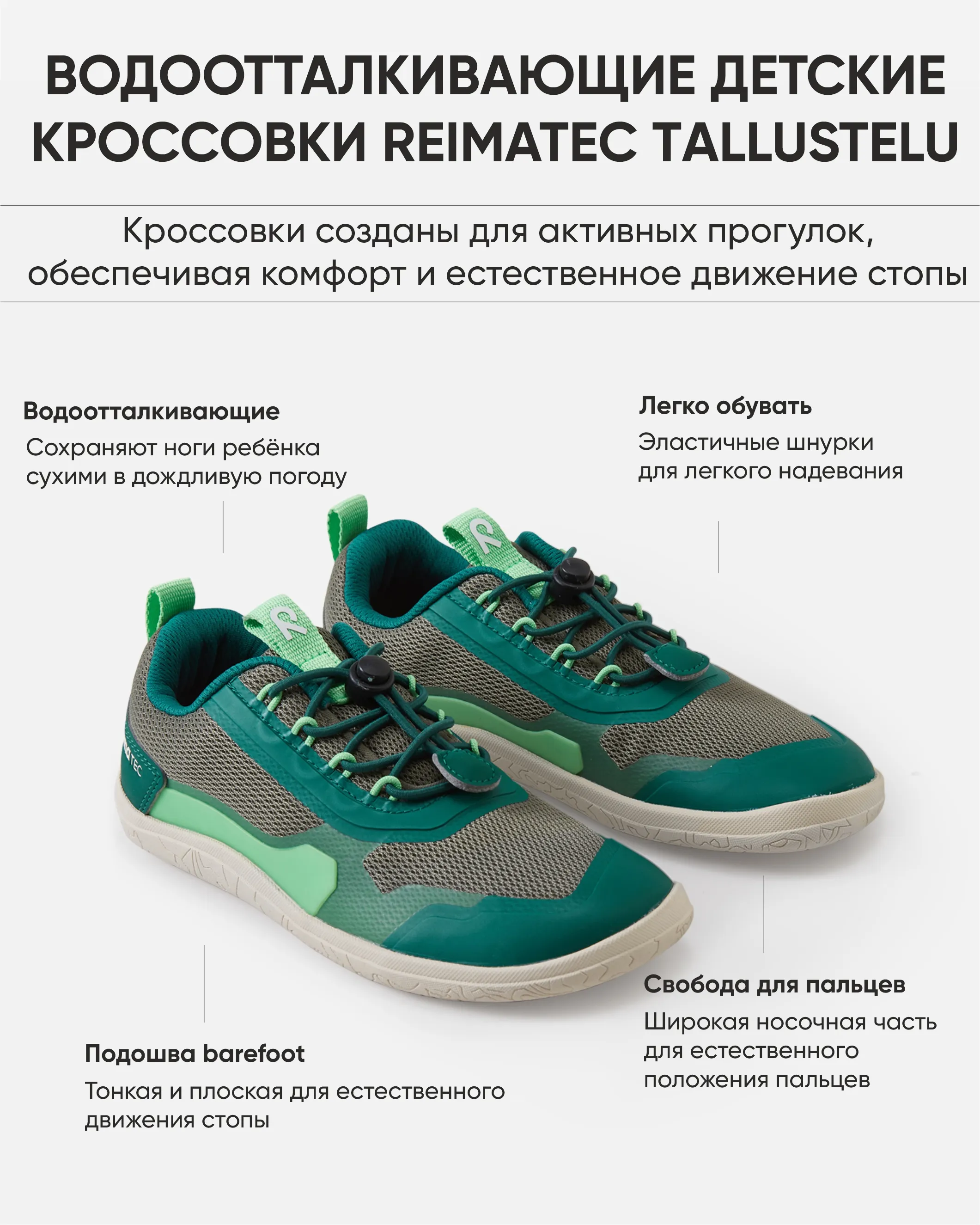 Водоотталкивающие кроссовки Reimatec Tallustelu сохранят ноги сухими, а детей счастливыми, а также поддерживают правильное развитие стопы благодаря широкой колодке Reima Barefoot с дополнительным местом для пальцев. Колодка в этой модели достаточно широка, чтобы все пальцы ног росли прямо, а подошва не имеет вызвышения под пяткой, что позволяет детям почувствовать более естественную стойку и спокойную ходьбу. Подошва тонкая, всего 4 мм, и гибкая, что позволяет лучше чувствовать землю и активизировать мышцы стопы. Благодаря удобным съемным стелькам и легким эластичным шнуркам эта отмеченная наградами обувь является лучшим выбором для Barefoot-комфорта в переменчивую погоду.