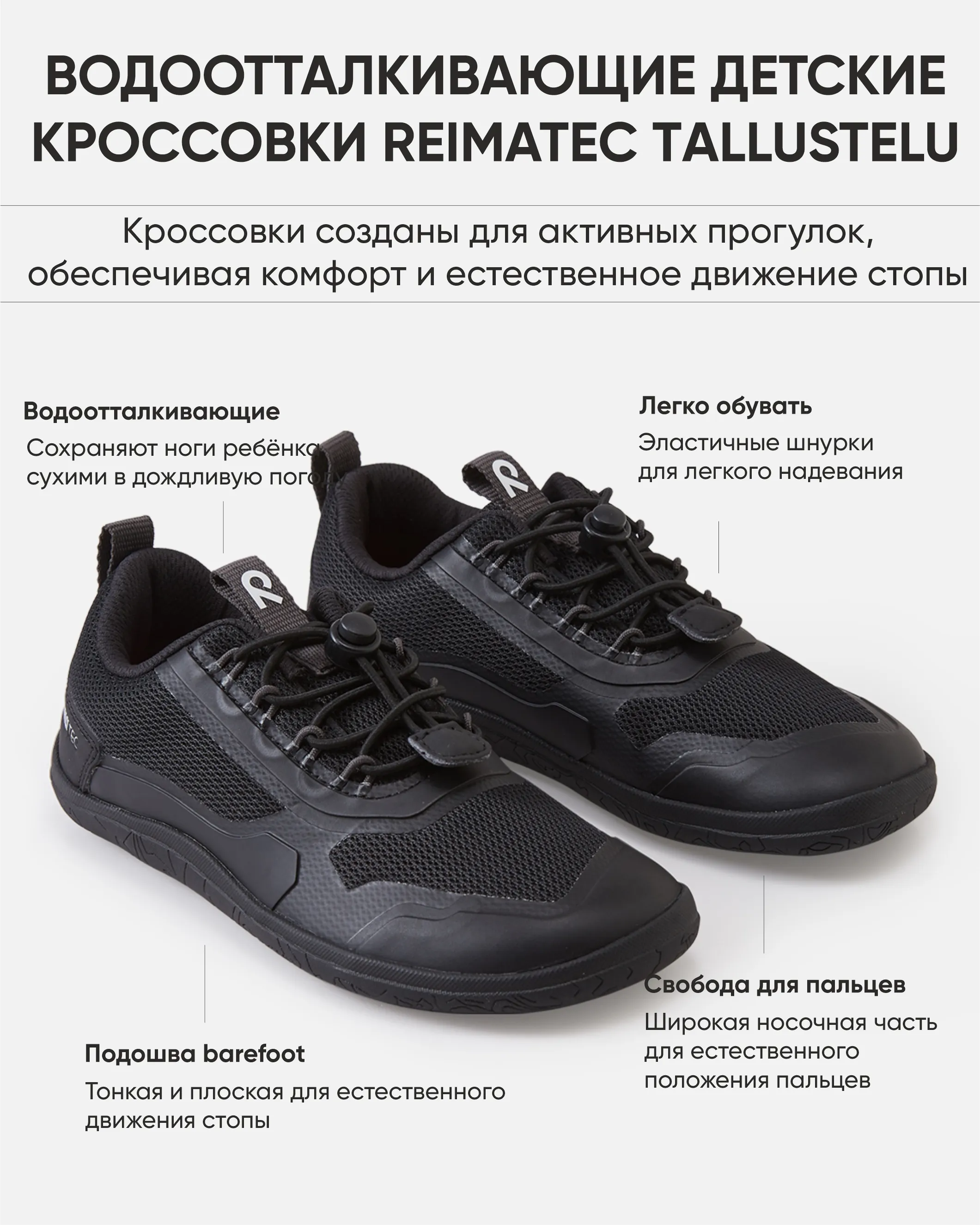 Водоотталкивающие кроссовки Reimatec Tallustelu сохранят ноги сухими, а детей счастливыми, а также поддерживают правильное развитие стопы благодаря широкой колодке Reima Barefoot с дополнительным местом для пальцев. Колодка в этой модели достаточно широка, чтобы все пальцы ног росли прямо, а подошва не имеет вызвышения под пяткой, что позволяет детям почувствовать более естественную стойку и спокойную ходьбу. Подошва тонкая, всего 4 мм, и гибкая, что позволяет лучше чувствовать землю и активизировать мышцы стопы. Благодаря удобным съемным стелькам и легким эластичным шнуркам эта отмеченная наградами обувь является лучшим выбором для Barefoot-комфорта в переменчивую погоду.