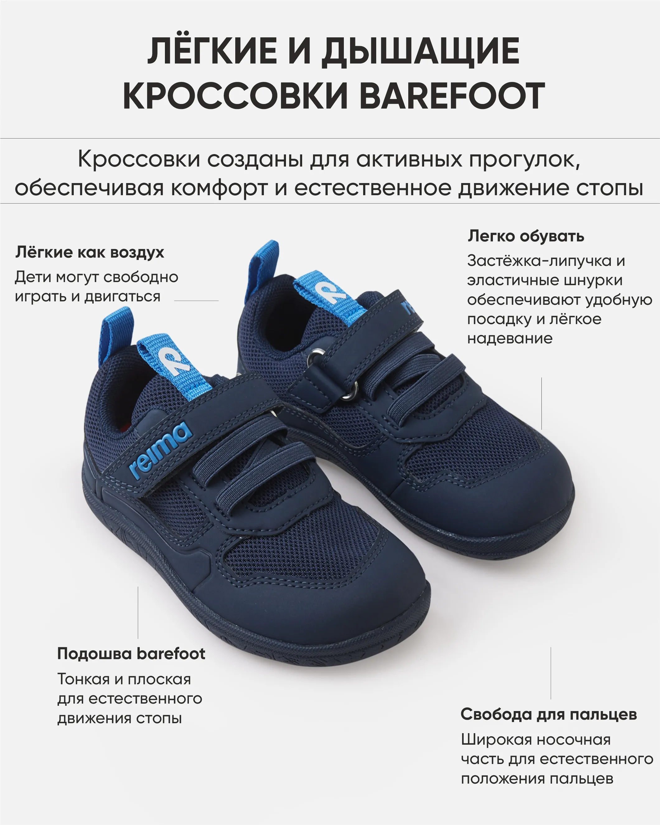 Эти barefoot-кроссовки разработаны для естественного и комфортного движения ребёнка во время активных прогулок. Лёгкая и хорошо дышащая конструкция помогает сохранять комфорт в течение дня. Нулевая разница между пяткой и носком способствует правильной осанке, а широкая носочная часть и гибкая подошва поддерживают естественное развитие стопы и укрепление мышц. Застёжка-липучка в сочетании с эластичными шнурками позволяет легко отрегулировать посадку, а гибкая резиновая подошва обеспечивает надёжное сцепление с поверхностью. Съёмные стельки Happy Fit помогают точно подобрать размер и контролировать рост стопы.