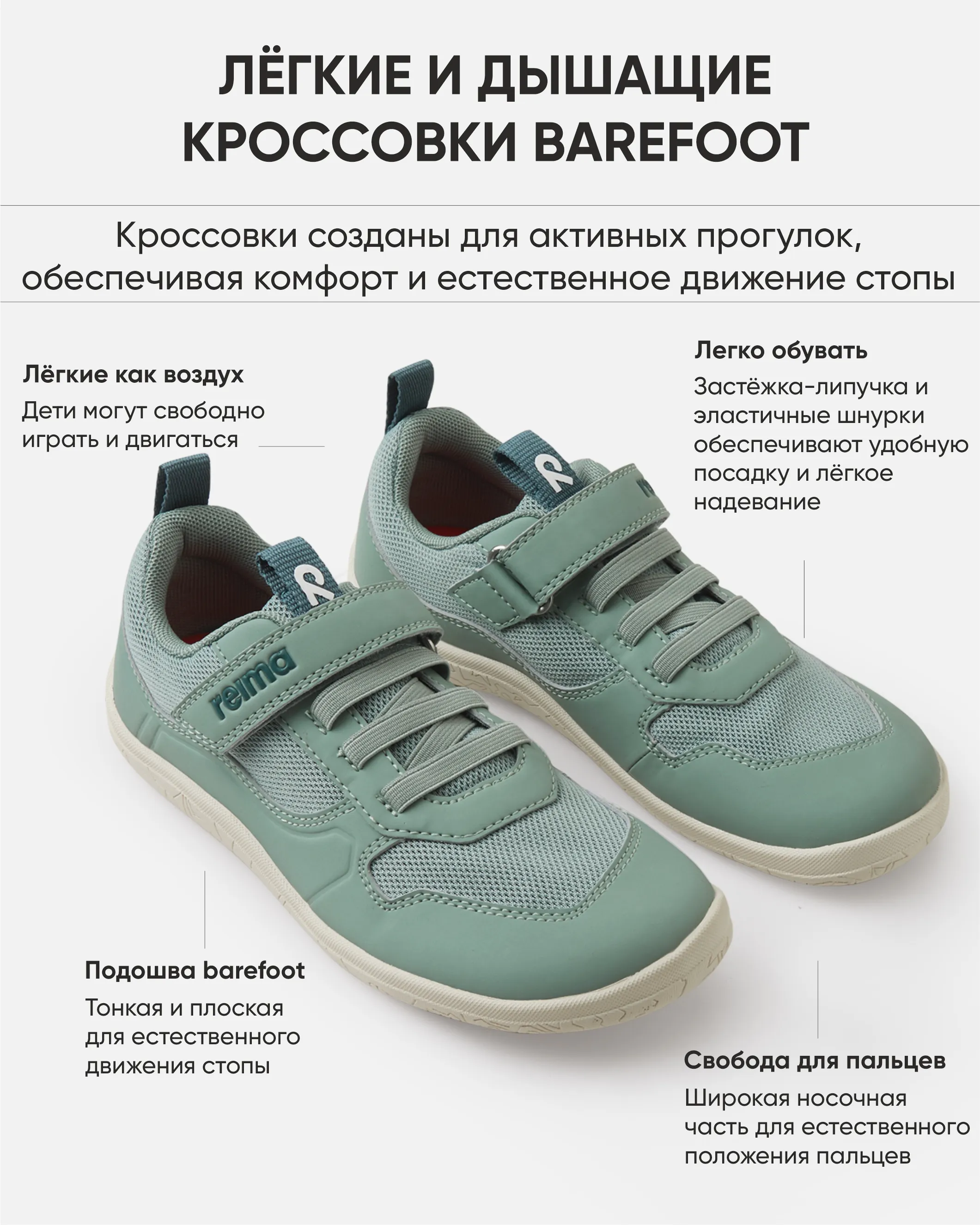 Barefoot-кроссовки подойдут для активных детей, которым важно естественное и свободное движение стопы. Лёгкая и дышащая конструкция помогает сохранять комфорт в течение дня, а широкая носочная часть и нулевой перепад между пяткой и носком способствуют правильному положению стопы и её естественному развитию. Гибкая подошва не ограничивает движения, а резиновый протектор обеспечивает надёжное сцепление с поверхностью. Застёжка-липучка в сочетании с эластичными шнурками позволяет точно отрегулировать посадку, а съёмные стельки Happy Fit помогают легко подобрать правильный размер и контролировать рост стопы.