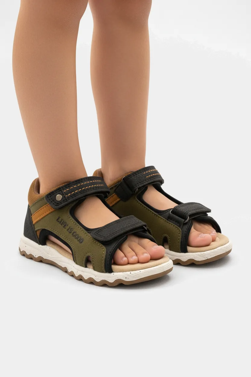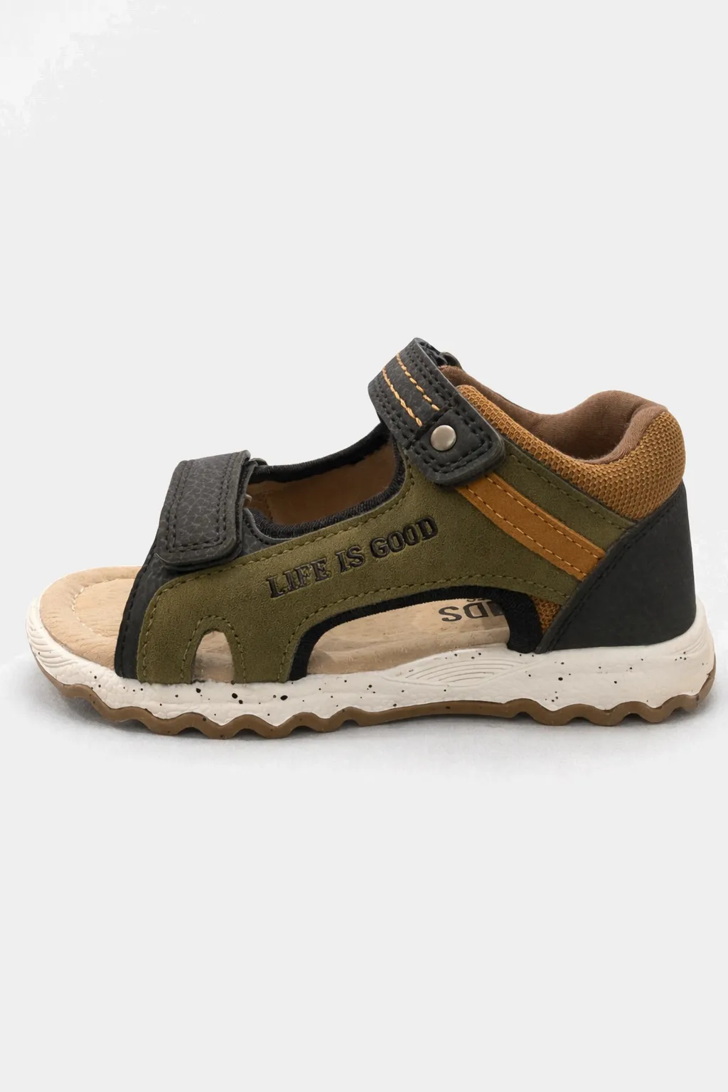 Летние сандалии для мальчика Okids с верхом из экокожи и текстиля, подкладкой из натуральной кожи и стелькой из 100% хлопка, обеспечивающей мягкость и комфорт.