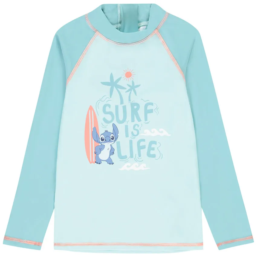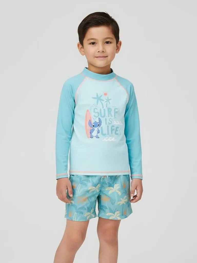 Рукава реглан создают удобную посадку и не сковывают движения ребёнка во время плавания и игр. Спереди расположен яркий принт с серфингистом Stitch, который придаёт модели весёлое летнее настроение.