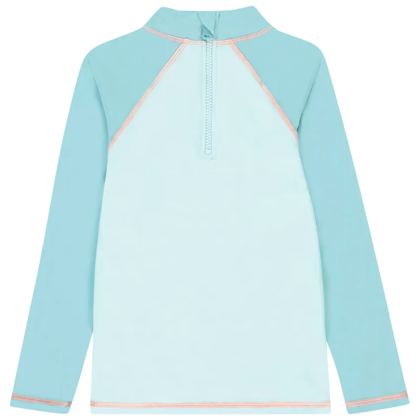 Модель выполнена в светло-бирюзовом цвете с эффектом color block, что делает дизайн ярким и современным. Высокий воротник обеспечивает дополнительную защиту от солнца.
