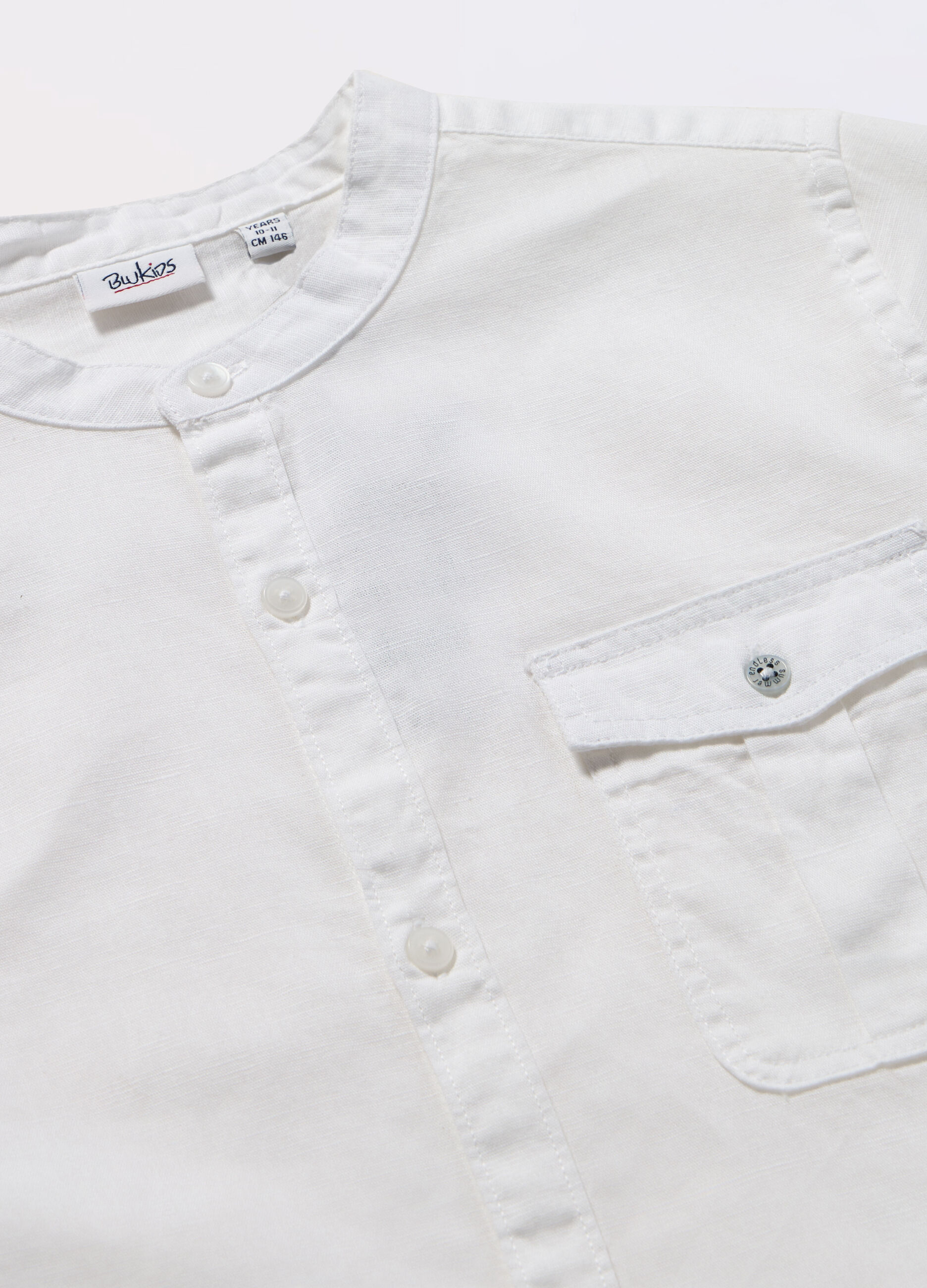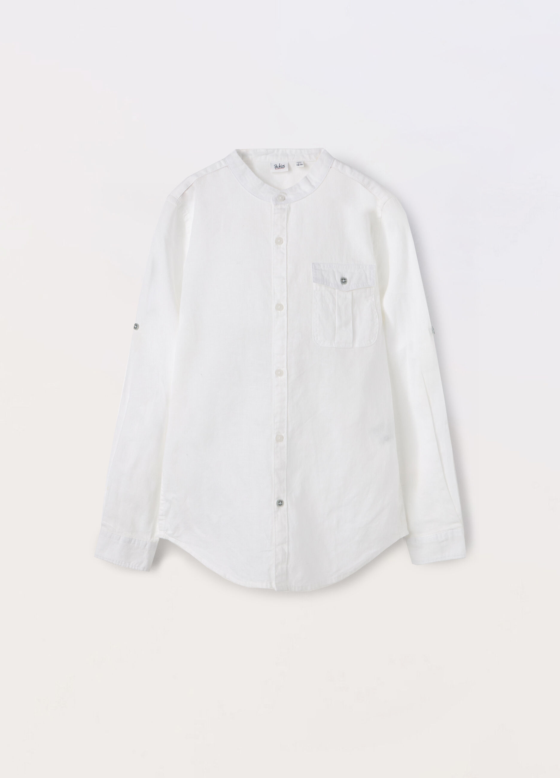 Легкая рубашка для мальчика из смесовой льняной ткани — стильная и удобная модель для теплых дней. Легкая и дышащая ткань обеспечивает комфорт и свободу движений. Воротник-стойка придает рубашке современный и аккуратный вид, а застежка на пуговицы делает её удобной для ношения. Длинные рукава можно подкатить, создавая более расслабленный стиль. Накладной карман спереди на пуговице добавляет не только функциональности, но и интересный акцент в дизайне. Эта рубашка идеально подходит для активных прогулок, походов на мероприятия или просто для повседневных образов мальчика.