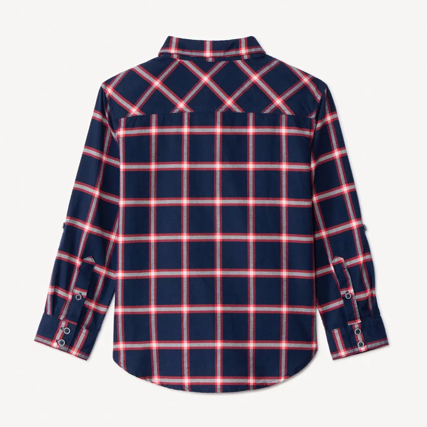 Рубашка с длинными рукавами из плотной хлопковой ткани. Выполнена в темно-синем цвете с клетчатым узором в красно-белых тонах. Застёгивается на пуговицы спереди, пуговицы с декоративным оформлением. Рукава можно подвернуть и зафиксировать. Манжеты с застёжкой на пуговицу. Классический воротник и удлинённая спинка создают аккуратный силуэт.