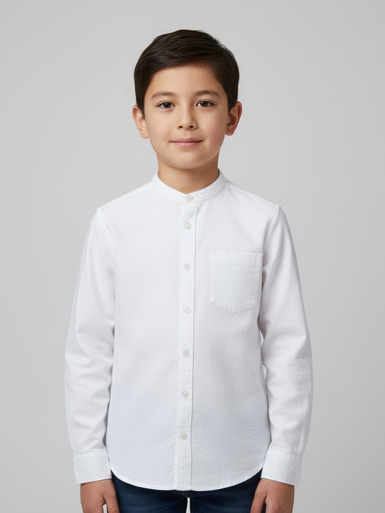 Модель дополнена аккуратным воротником-стойкой, который придаёт образу современный и аккуратный вид. Спереди расположена застёжка на пуговицы, а манжеты на рукавах также фиксируются пуговицами, благодаря чему рубашку удобно надевать и носить.