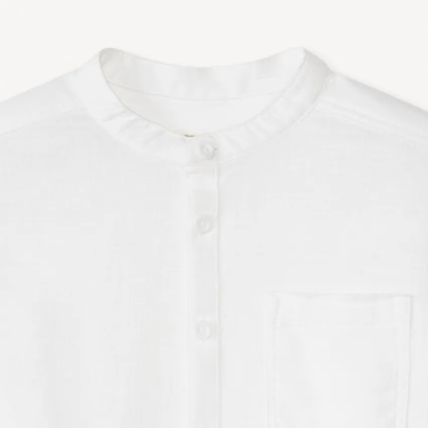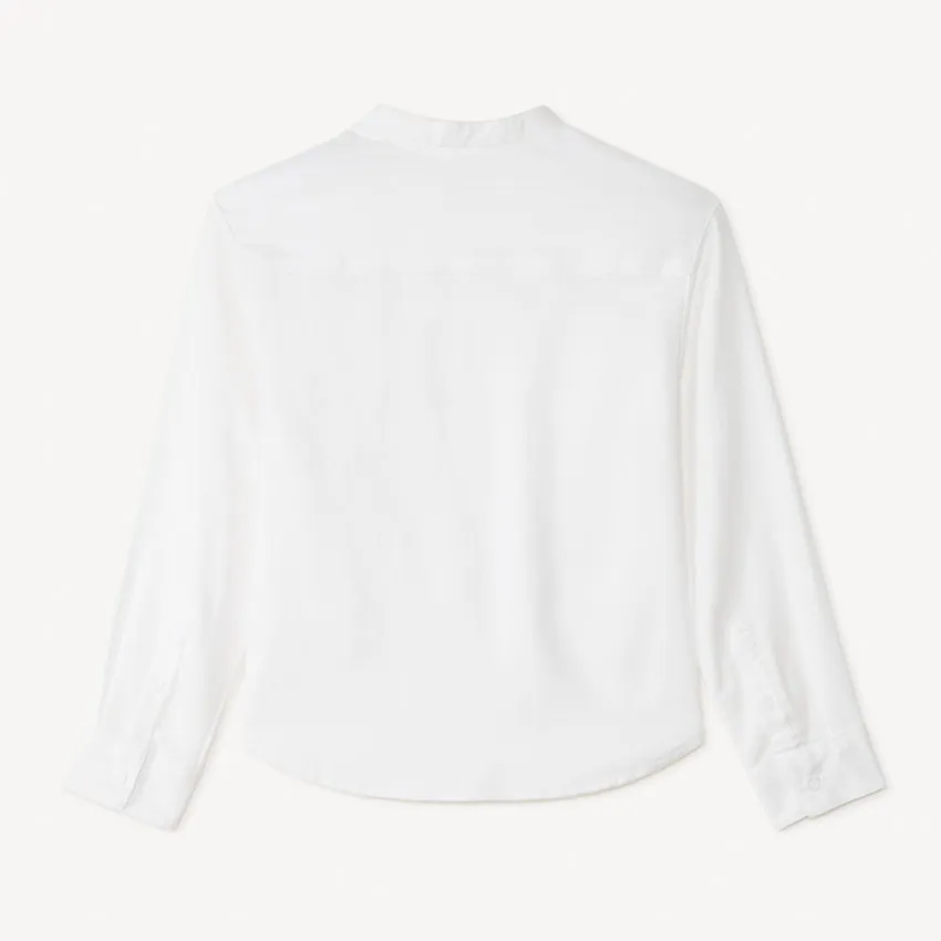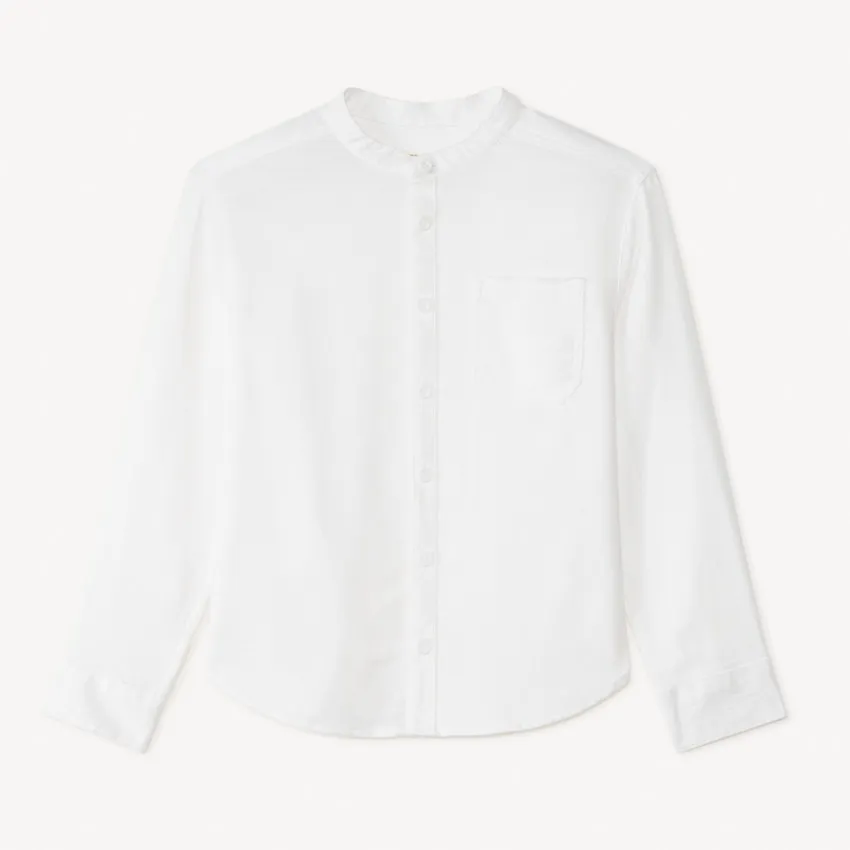 Модель дополнена аккуратным воротником-стойкой, который придаёт образу современный и аккуратный вид. Спереди расположена застёжка на пуговицы, а манжеты на рукавах также фиксируются пуговицами, благодаря чему рубашку удобно надевать и носить.