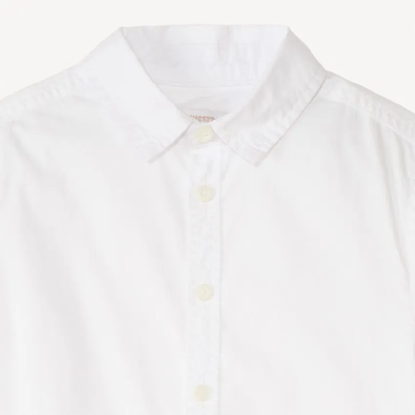 Рубашка выполнена в классическом белом цвете и дополнена аккуратным отложным воротником. Спереди расположена удобная застёжка на пуговицы, благодаря которой её легко надевать и снимать.