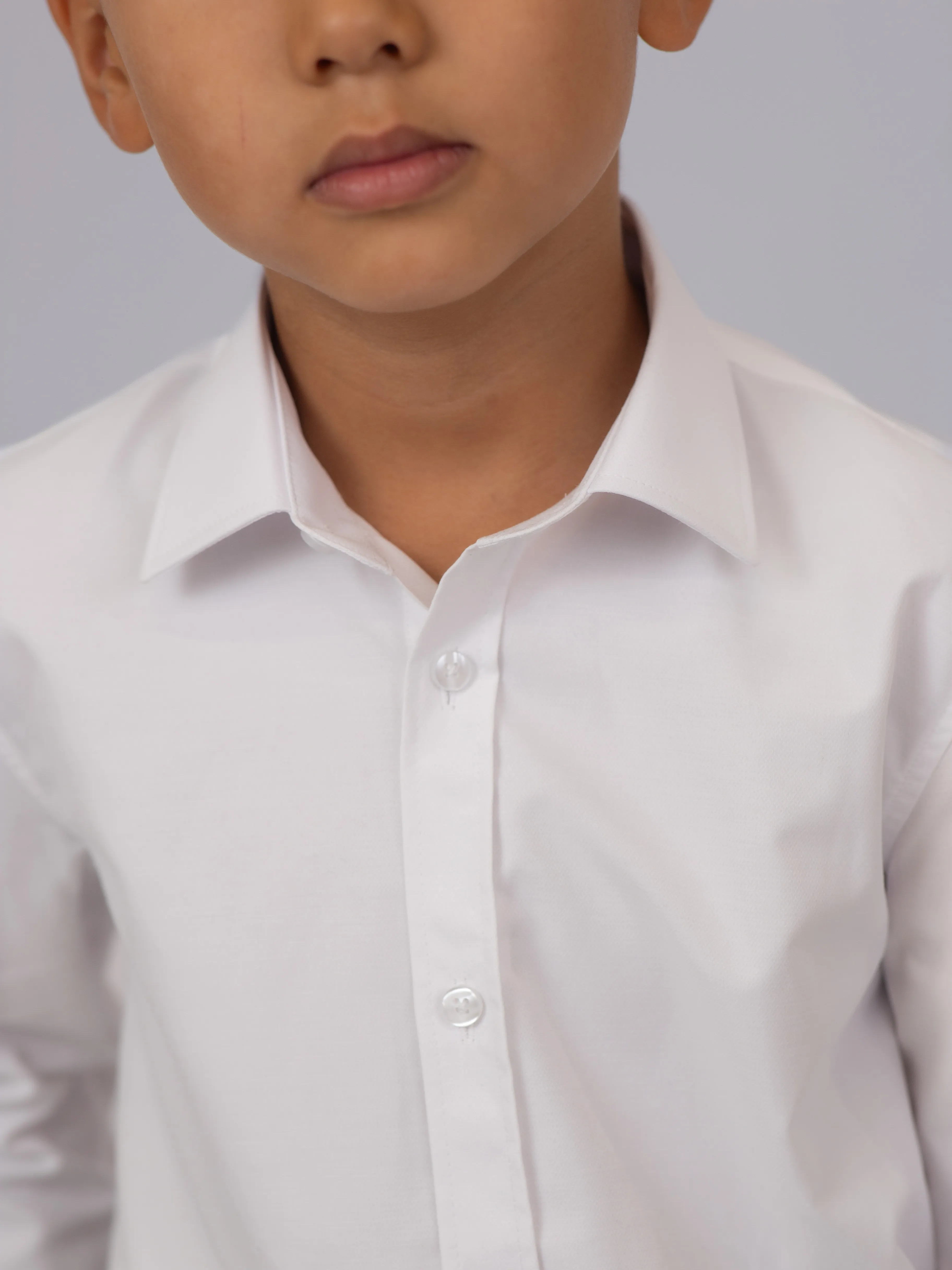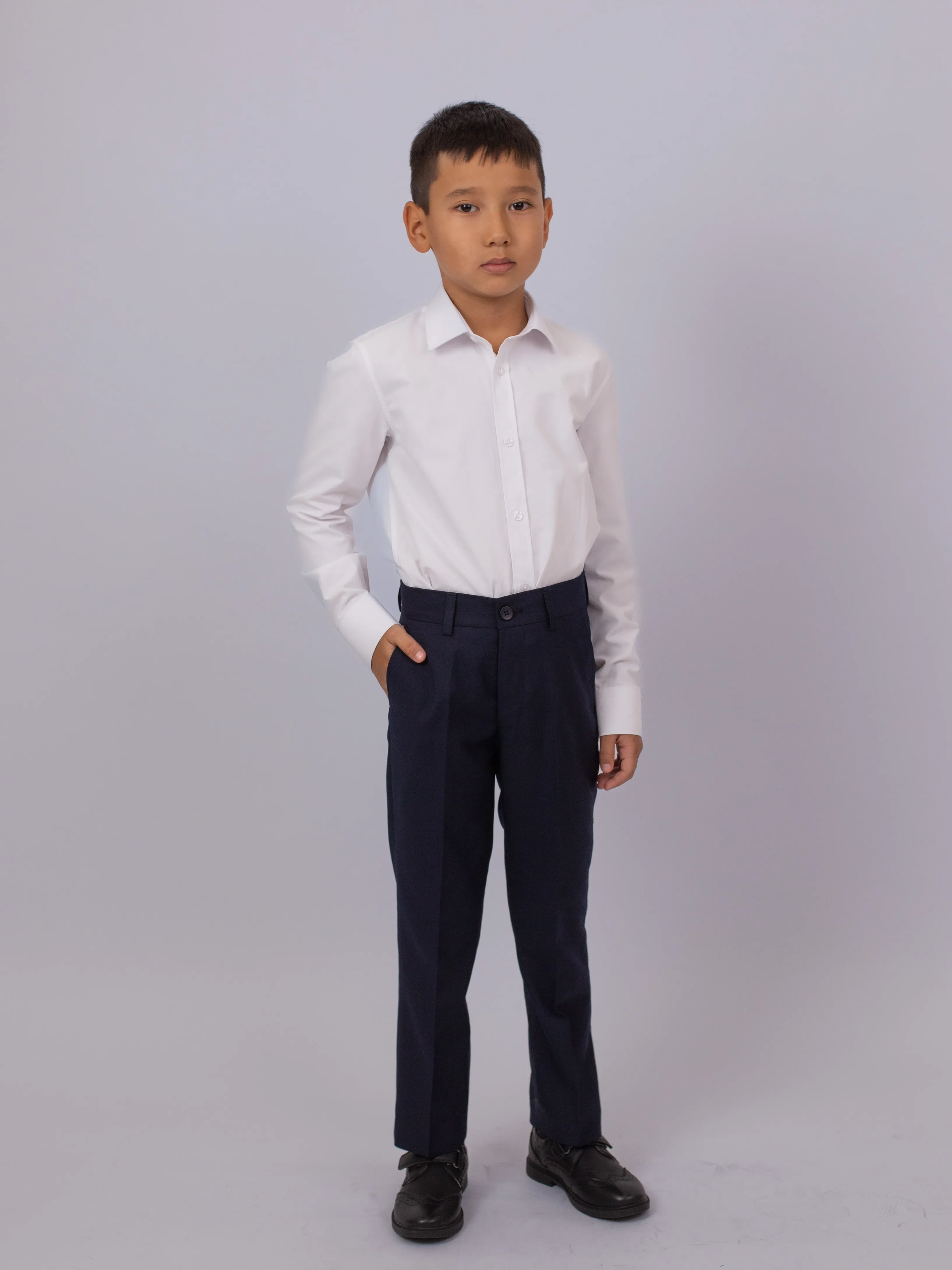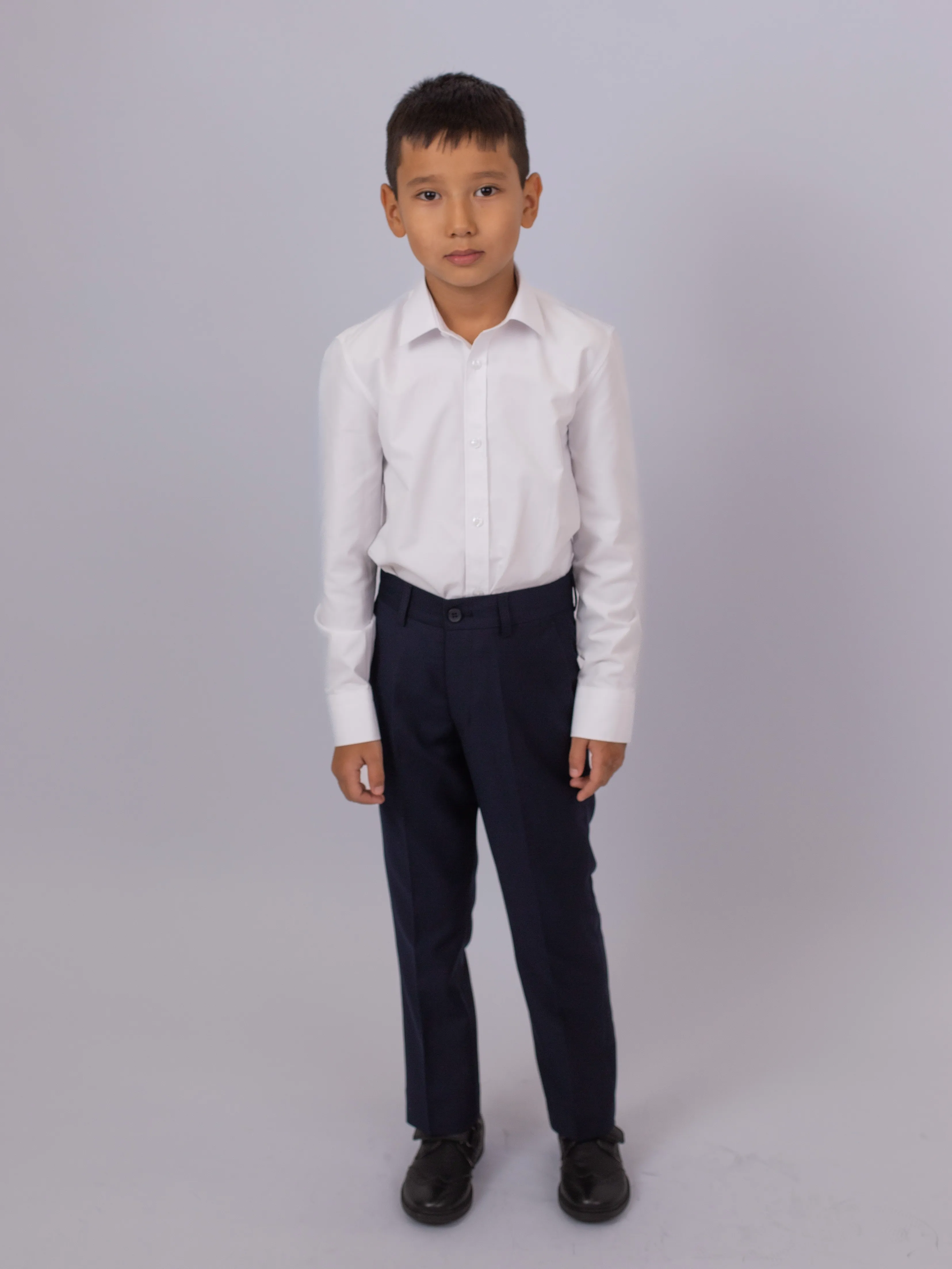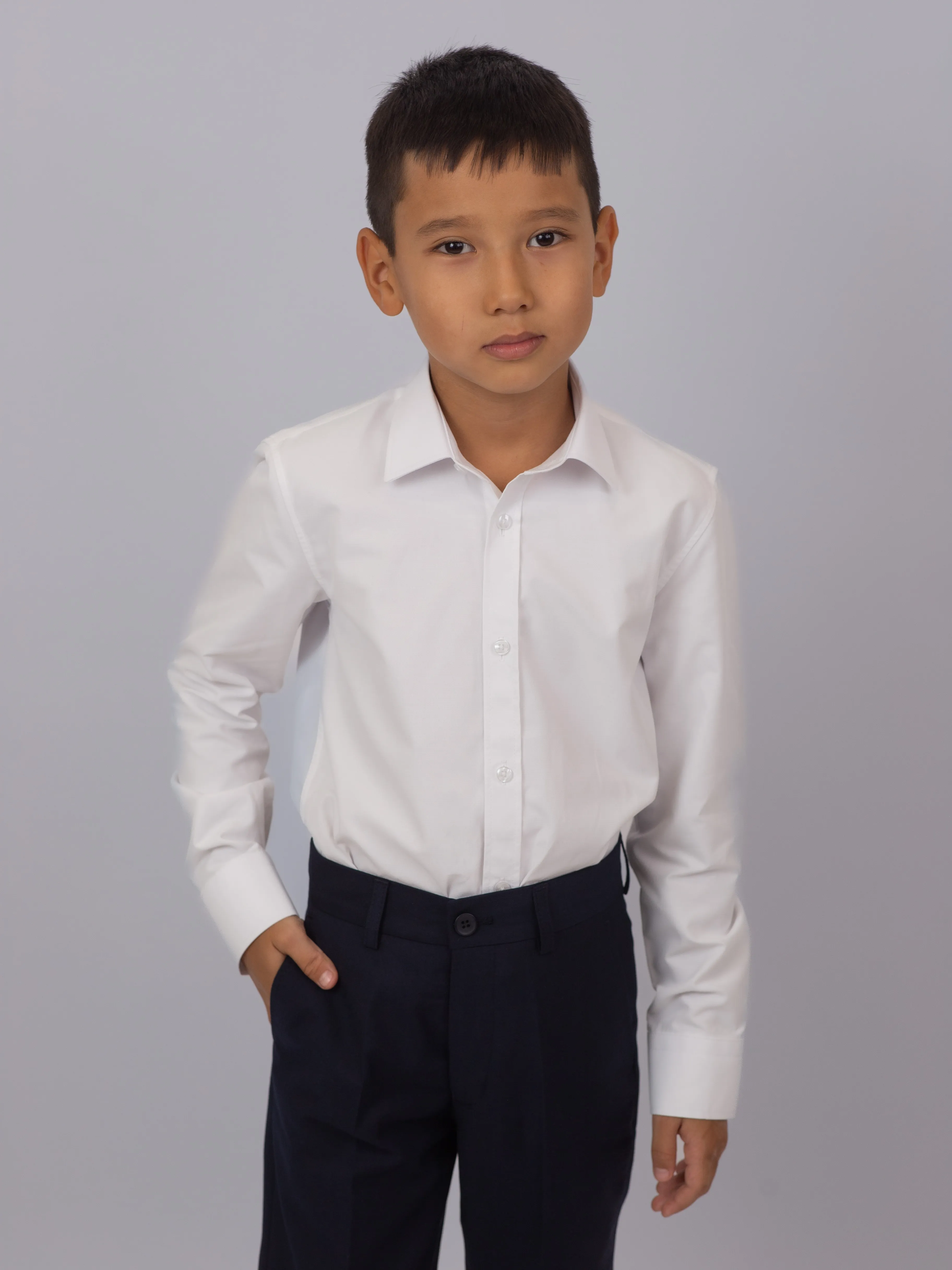 Сорочка оснащена манжетами на пуговицах, что придает ей строгий и аккуратный вид. Идеально подходит для школьных дней и официальных мероприятий, легко комбинируется с брюками и жилетами. Простой, но стильный выбор для школьников.