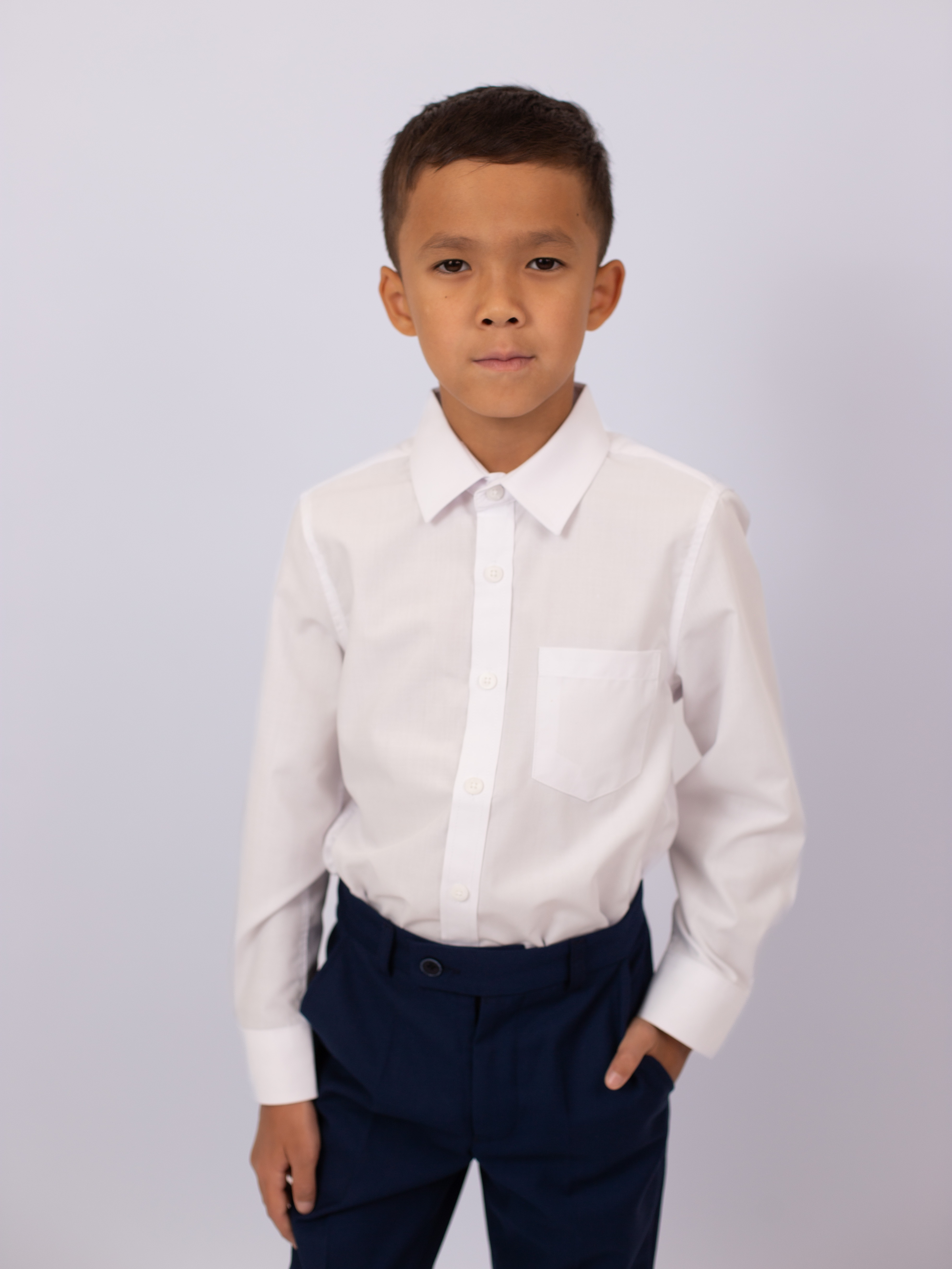 Модель классического кроя с воротником и нагрудным карманом сочетается с любыми элементами школьной формы — брюками, жилетом или пиджаком. Длинные рукава с манжетами придают сорочке строгий и аккуратный вид.