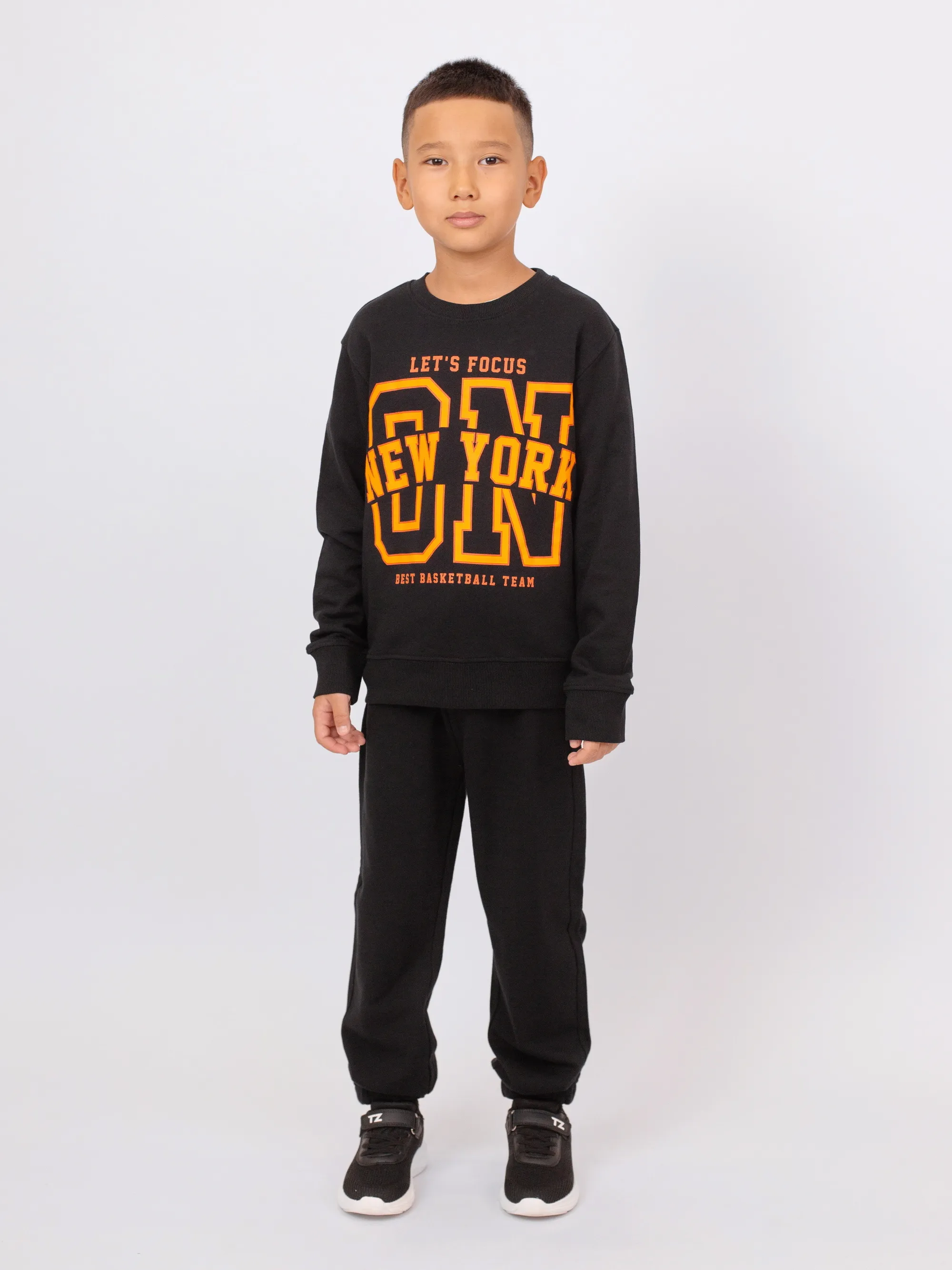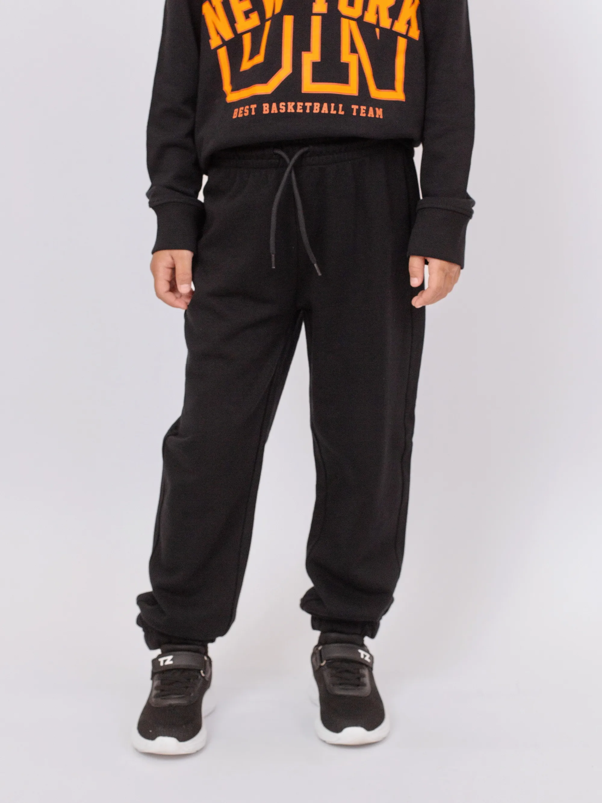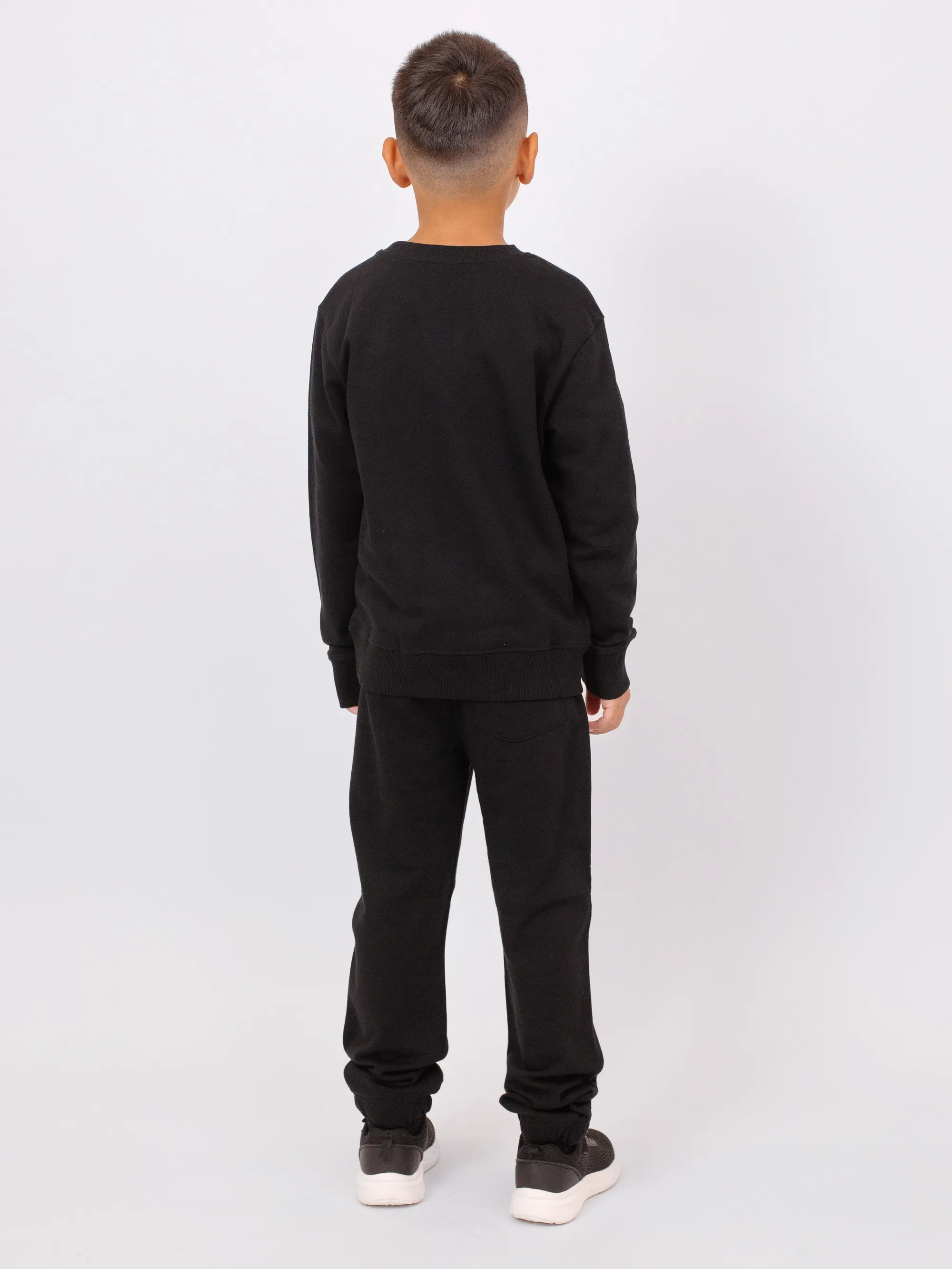 Чёрный спортивный костюм, состоящий из однотонных брюк на резинке с манжетами и удобного свитшота. Верх выполнен с крупной контрастной надписью спереди, что придаёт образу динамичный и современный стиль. Мягкий и приятный к телу материал обеспечивает комфорт при активных занятиях и в повседневной носке.
