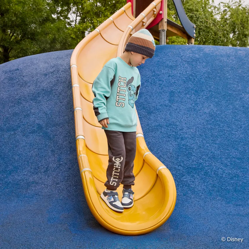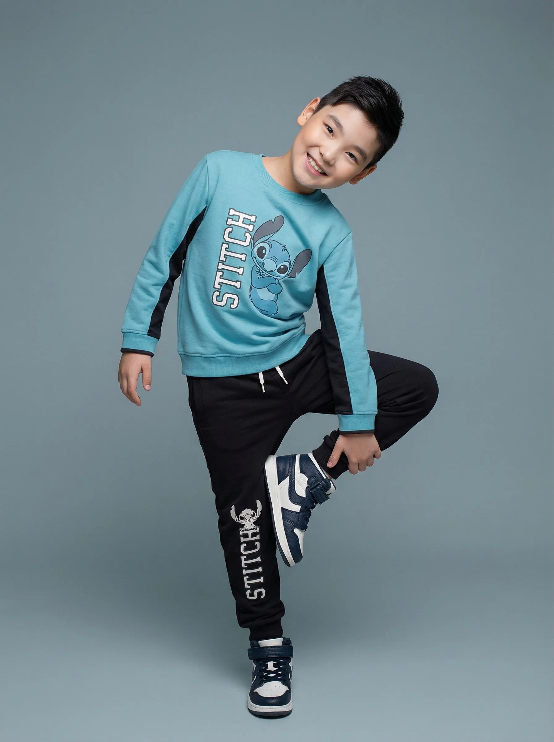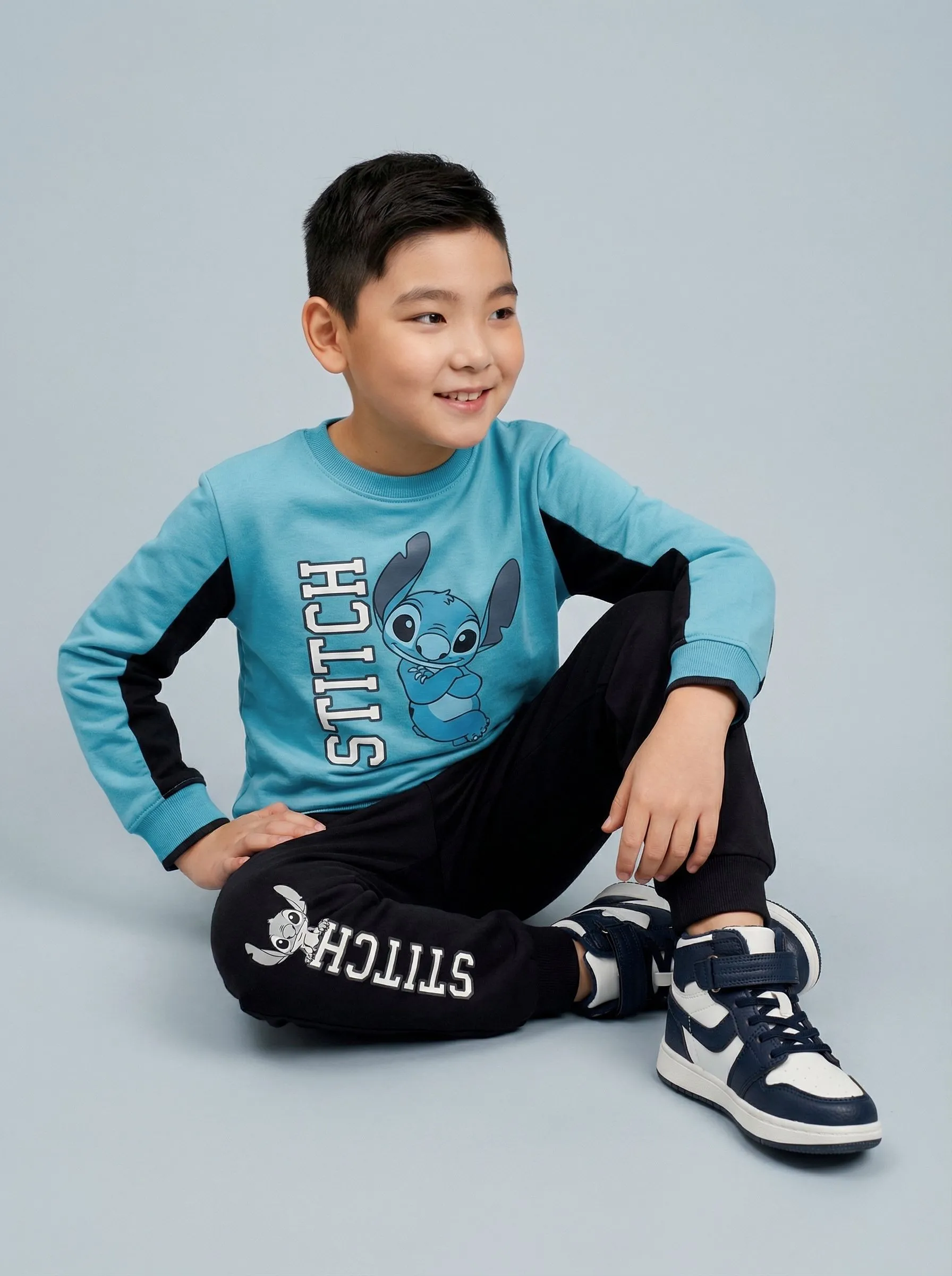 Спортивный костюм для мальчика, состоящий из свитшота и спортивных брюк, с ярким принтом в виде Стича — идеальный выбор для активных детей. Свитшот с длинными рукавами и стильным принтом придаёт образу яркость и индивидуальность. Брюки с эластичной талией и шнурком обеспечивают удобную посадку, а карманы на брюках и свитшоте добавляют практичности. Костюм выполнен из мягкого и комфортного материала, который идеально подходит для повседневной носки и активных игр.