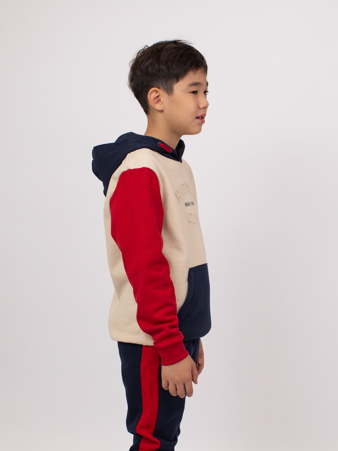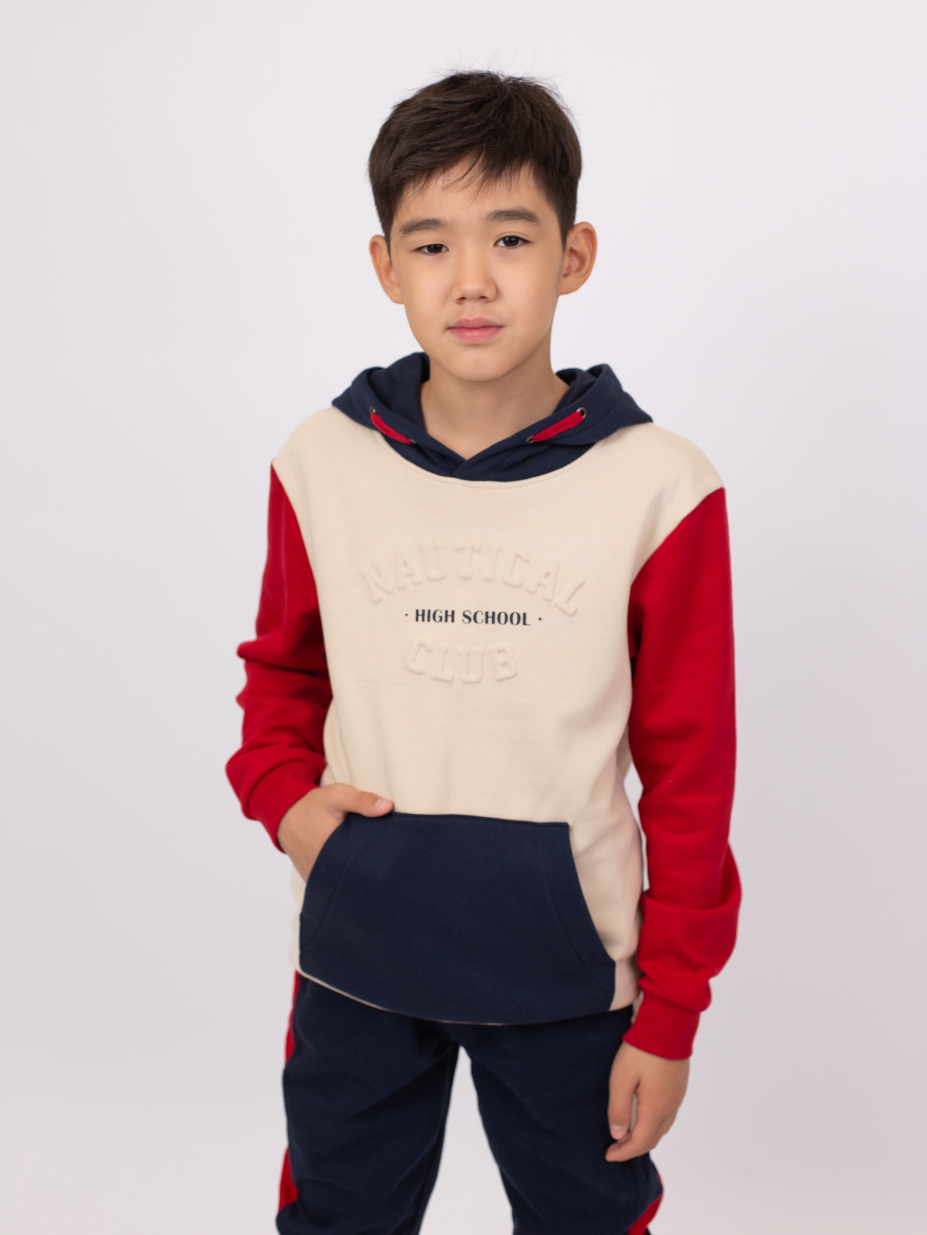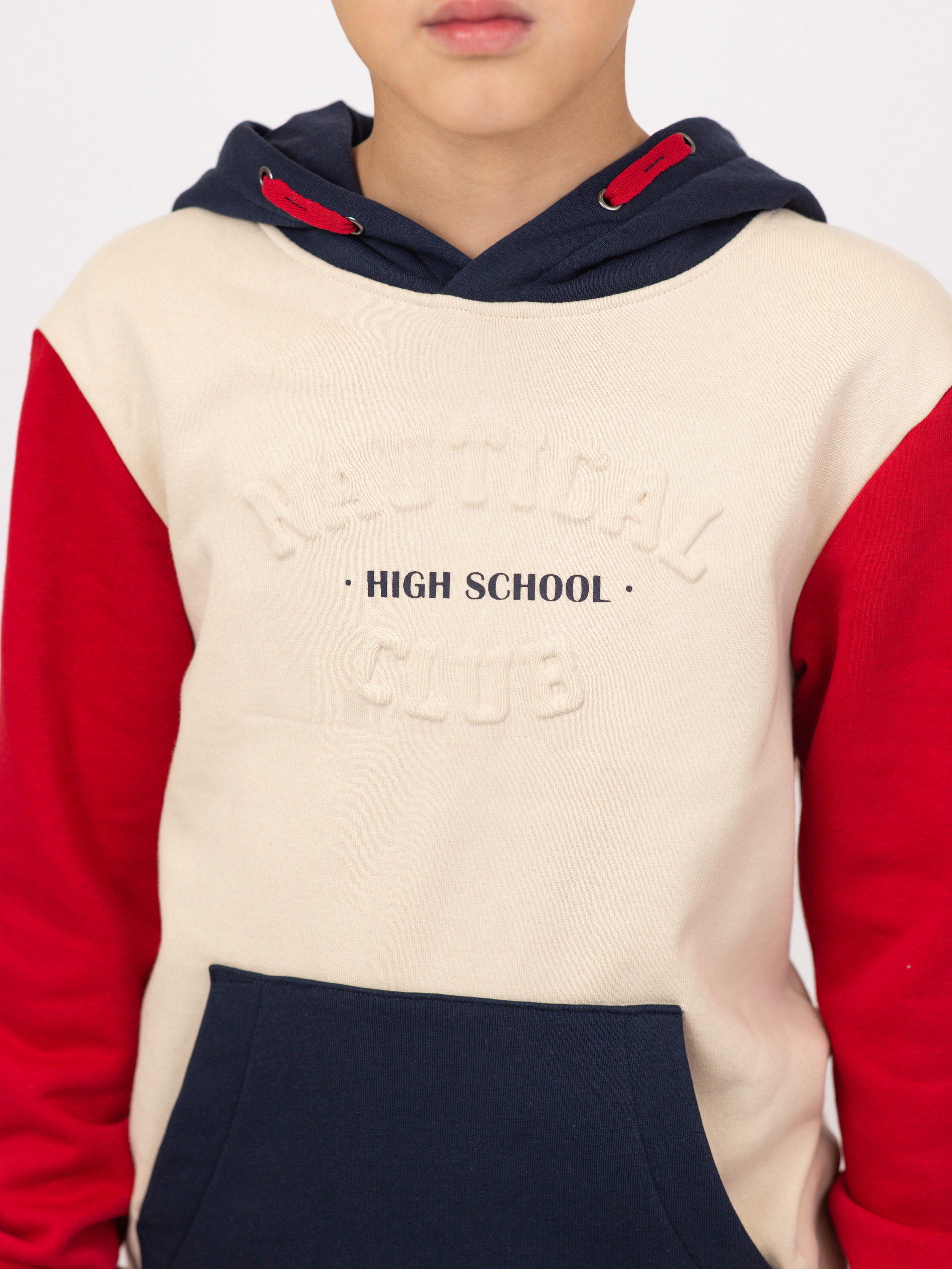 Худи из мягкого флиса с эффектом колорблок. Контрастный внутренний шнурок в капюшоне. Спереди объёмный рельефный принт и большой карман «кенгуру». Манжеты и низ на эластичной резинке. Спинка однотонная.