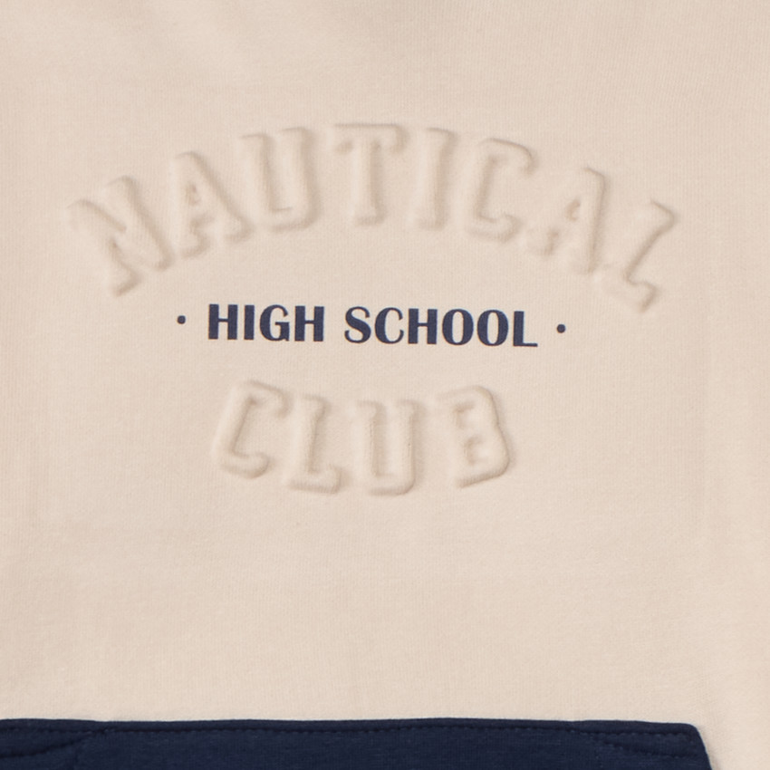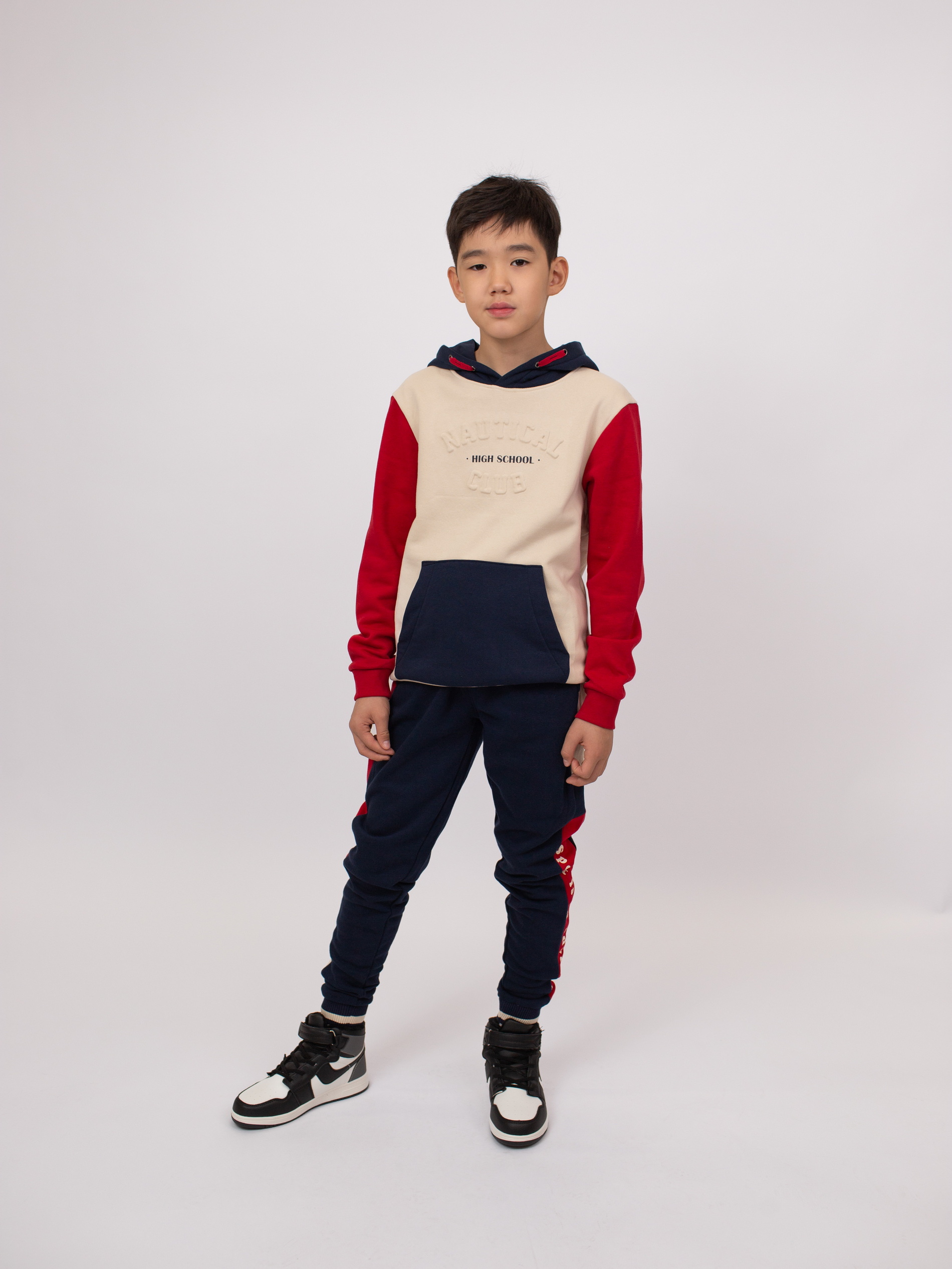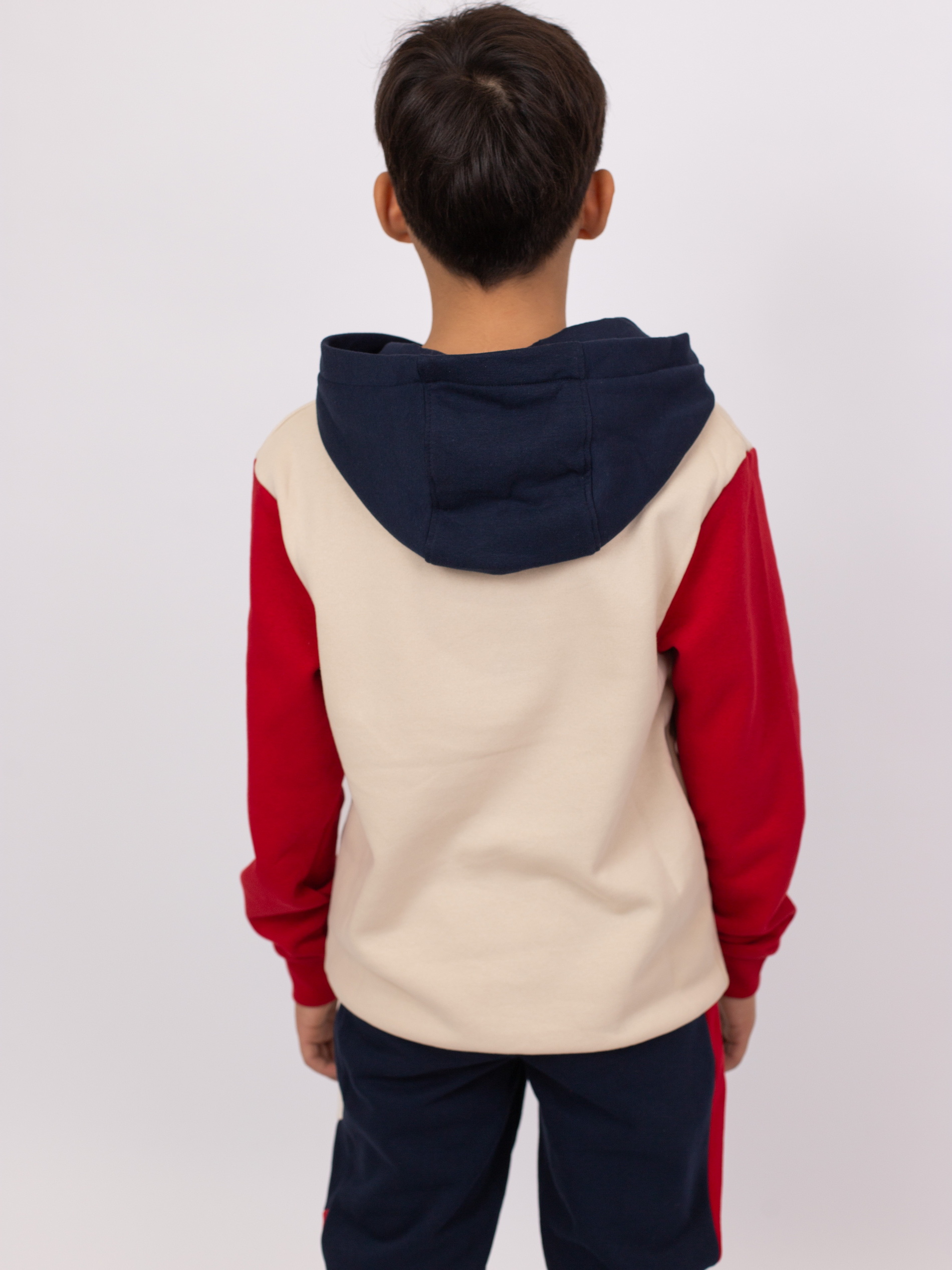Худи из мягкого флиса с эффектом колорблок. Контрастный внутренний шнурок в капюшоне. Спереди объёмный рельефный принт и большой карман «кенгуру». Манжеты и низ на эластичной резинке. Спинка однотонная.