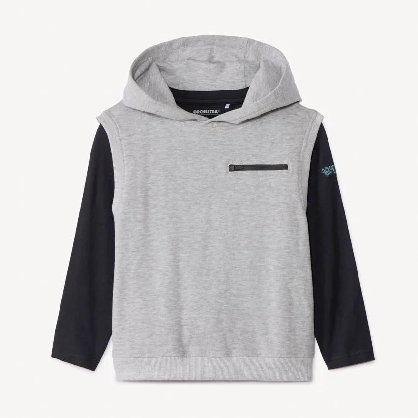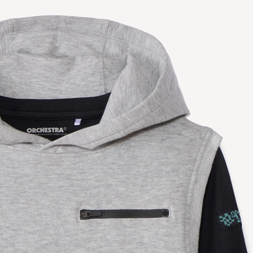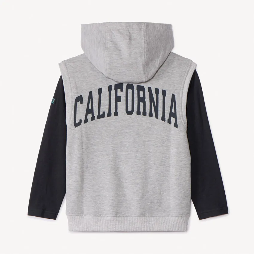 Свитшот без рукавов из светло-серого флиса, с круглым вырезом и капюшоном того же цвета. Спереди горизонтальный карман на молнии чёрного цвета с левой стороны груди. Низ слегка присборенный, спинка однотонная.