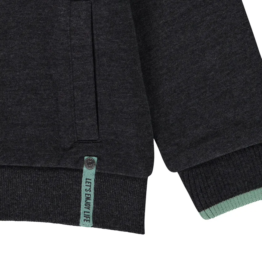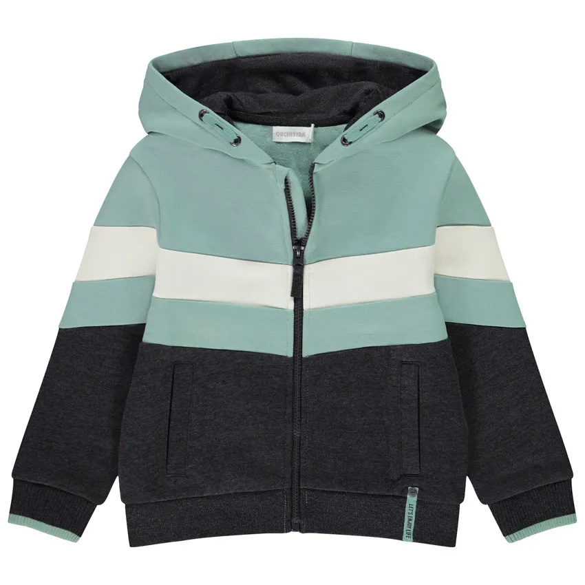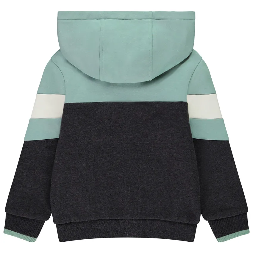 Толстовка из мягкого флиса с эффектом color-block. Модель выполнена в трёхцветном дизайне и оснащена удобным капюшоном с декоративными шнурками. Спереди — застёжка-молния с защитой подбородка и два кармана реглан. Свободный крой обеспечивает комфорт, а эластичные манжеты и нижняя резинка хорошо удерживают тепло. Контрастная отделка манжет и фирменная этикетка у нижнего края придают изделию стильный спортивный акцент.