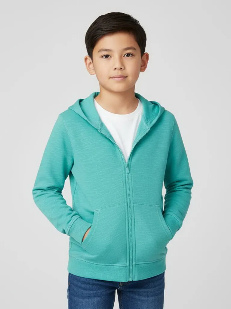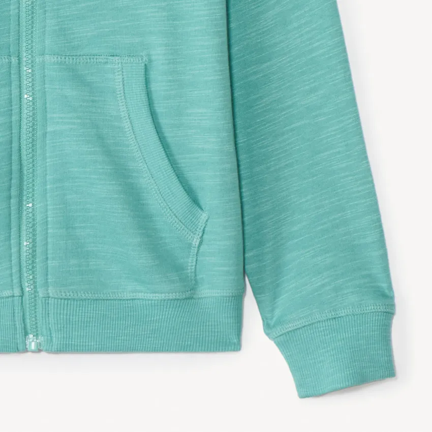 Толстовка выполнена в однотонном зелёном цвете и дополнена капюшоном, который защищает от ветра и прохладной погоды. Спереди расположена удобная застёжка на молнию с защитой для подбородка.