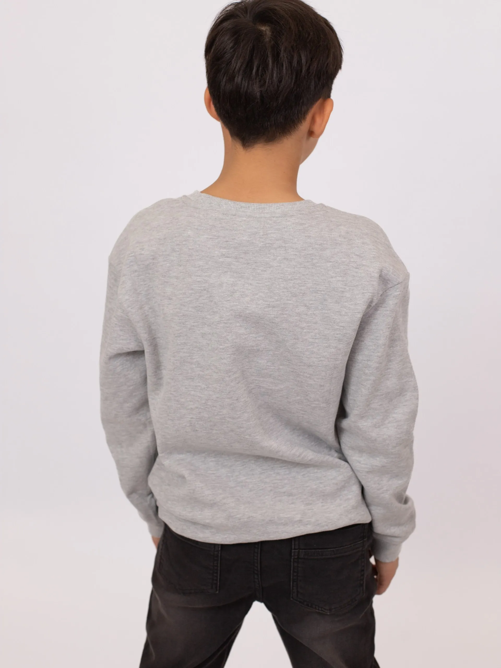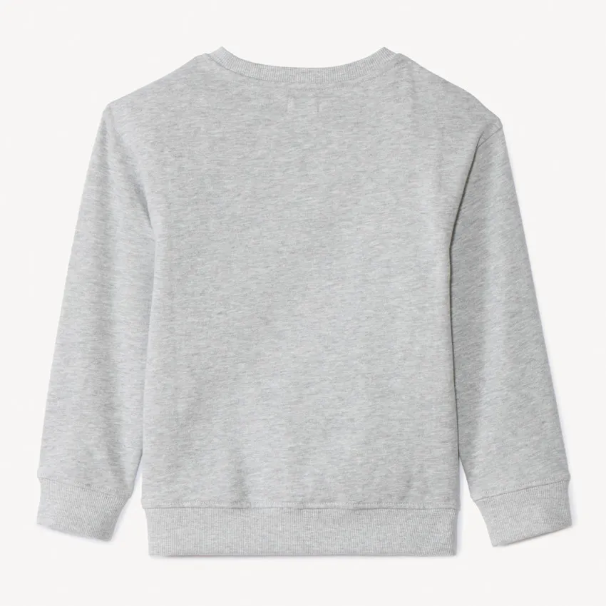 Свитшот из мягкого флиса серого меланжевого цвета. Круглый вырез из трикотажа в рубчик, длинные рукава. Спереди вышивка «California» и декоративный принт с баскетбольной тематикой. Манжеты и низ на эластичной резинке. Спинка однотонная.
