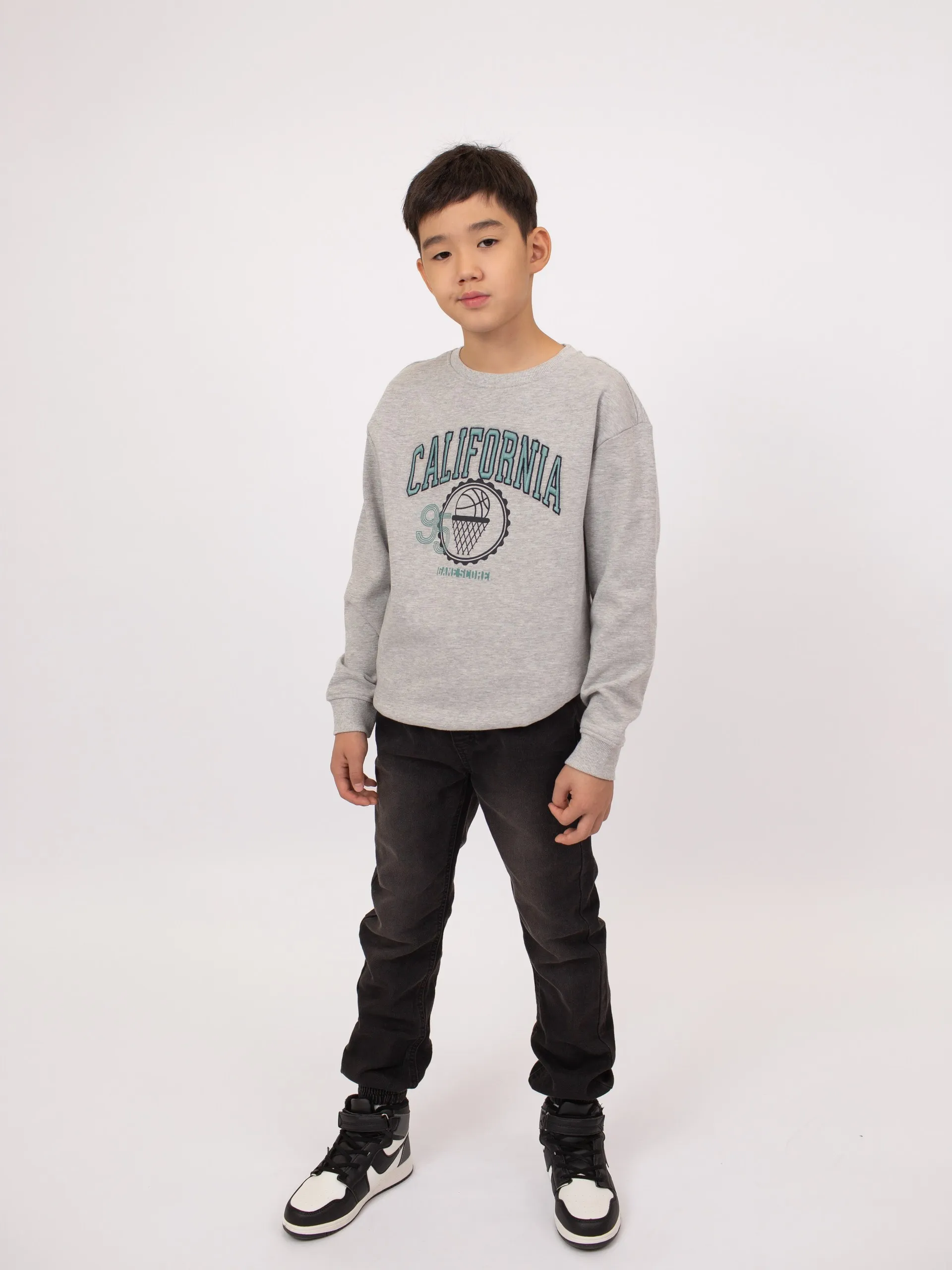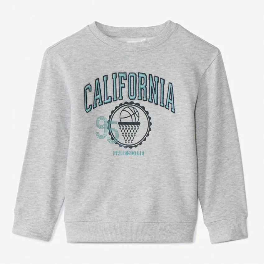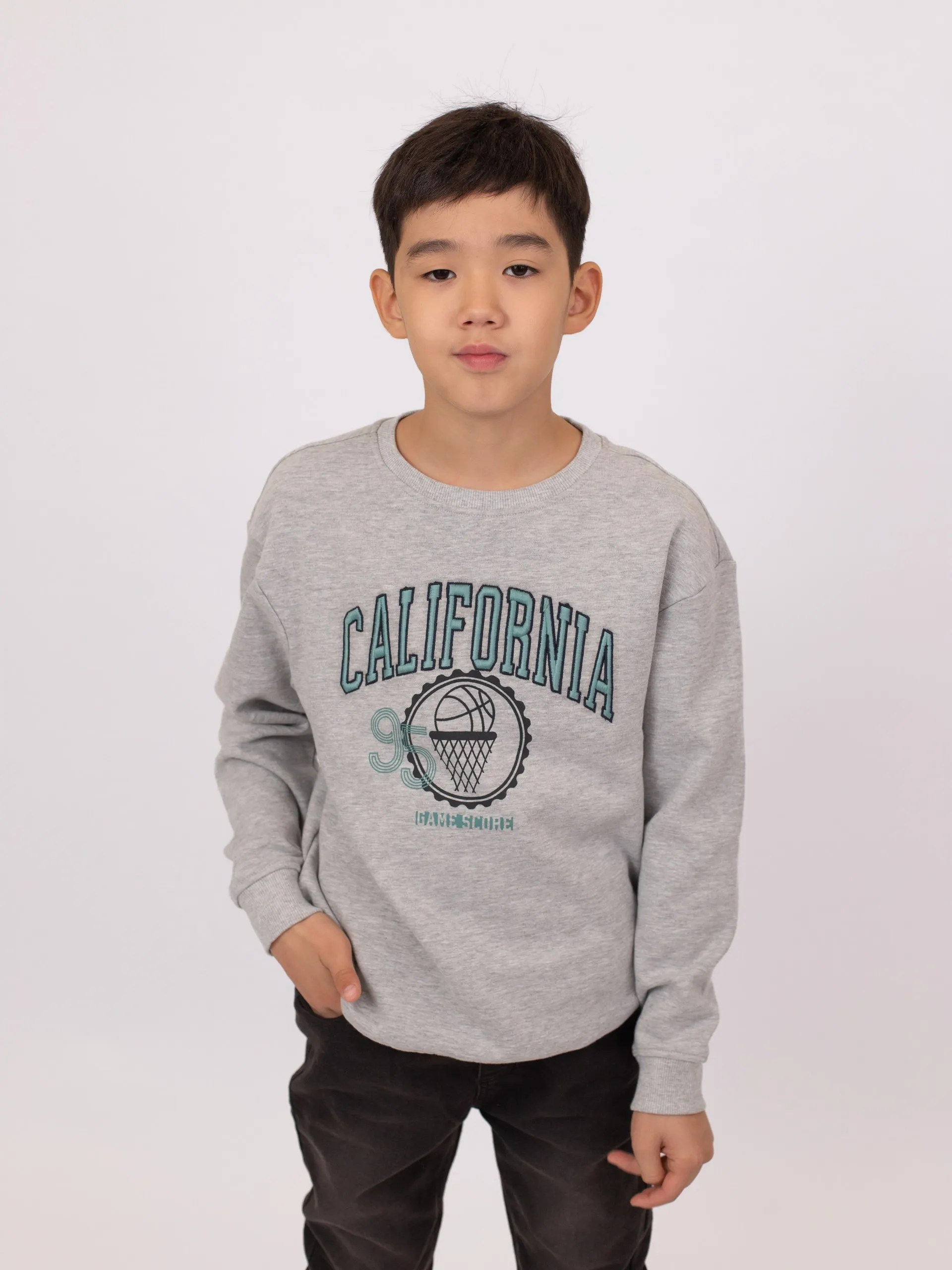 Свитшот из мягкого флиса серого меланжевого цвета. Круглый вырез из трикотажа в рубчик, длинные рукава. Спереди вышивка «California» и декоративный принт с баскетбольной тематикой. Манжеты и низ на эластичной резинке. Спинка однотонная.