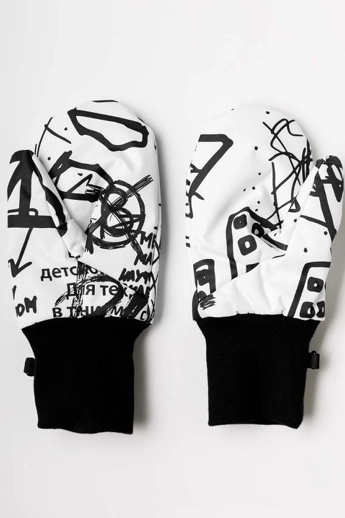 Высокие манжеты из рибаны плотно прилегают к руке и предотвращают попадание снега внутрь. Для удобства хранения и предотвращения потери варежки соединяются между собой с помощью карабина.