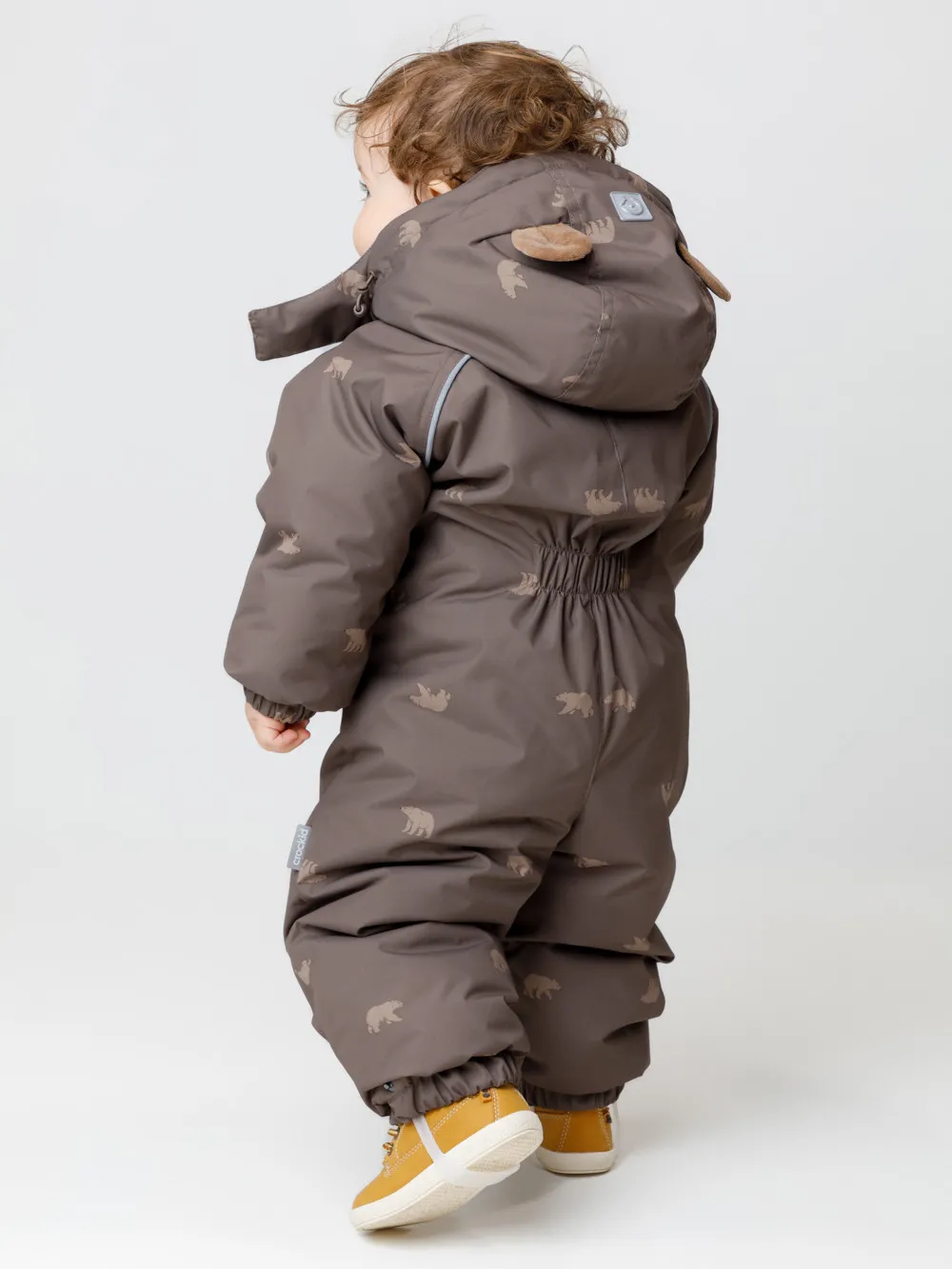 Комбинезон застёгивается на молнию и планку на липучках, оснащён защитой подбородка. Несъёмный капюшон регулируется эластичной утяжкой со стопперами. Для лучшей посадки предусмотрена резинка по спинке.