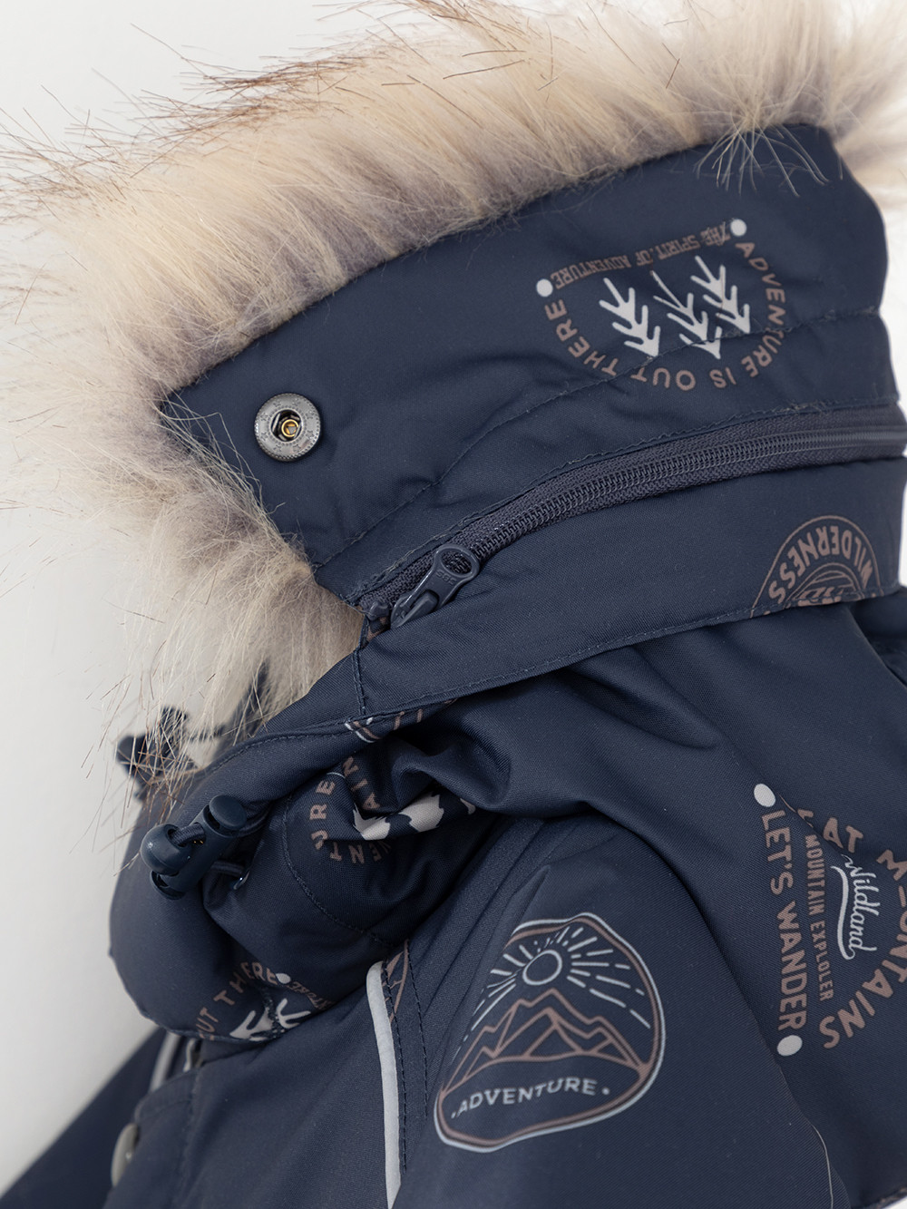 Несъёмный капюшон снабжён утяжкой со стопперами и отстёгивающимся мехом на молнии.