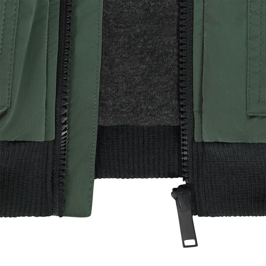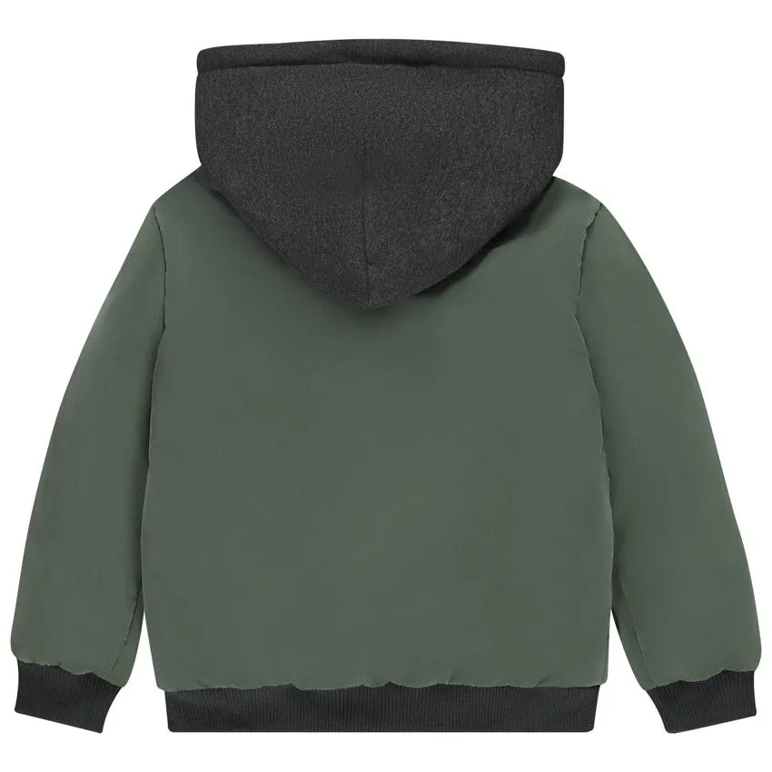 Модель дополнена контрастным флисовым капюшоном, который придаёт образу яркий акцент. Спереди — два накладных кармана с клапанами на кнопках для удобного хранения мелочей.