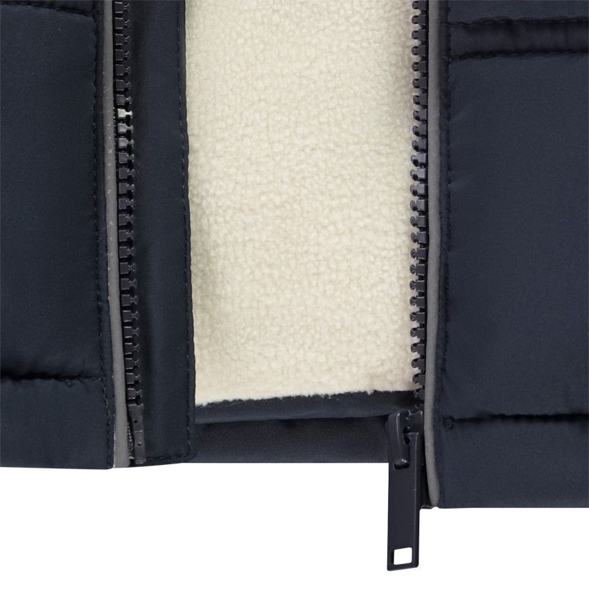 Куртка выполнена из 100% полиэстера — прочного и износостойкого материала, который хорошо сохраняет форму и прост в уходе. Стёганая конструкция с пуховым утеплением обеспечивает надёжную теплоизоляцию, а подкладка из микрофлиса добавляет мягкость и комфорт при носке.