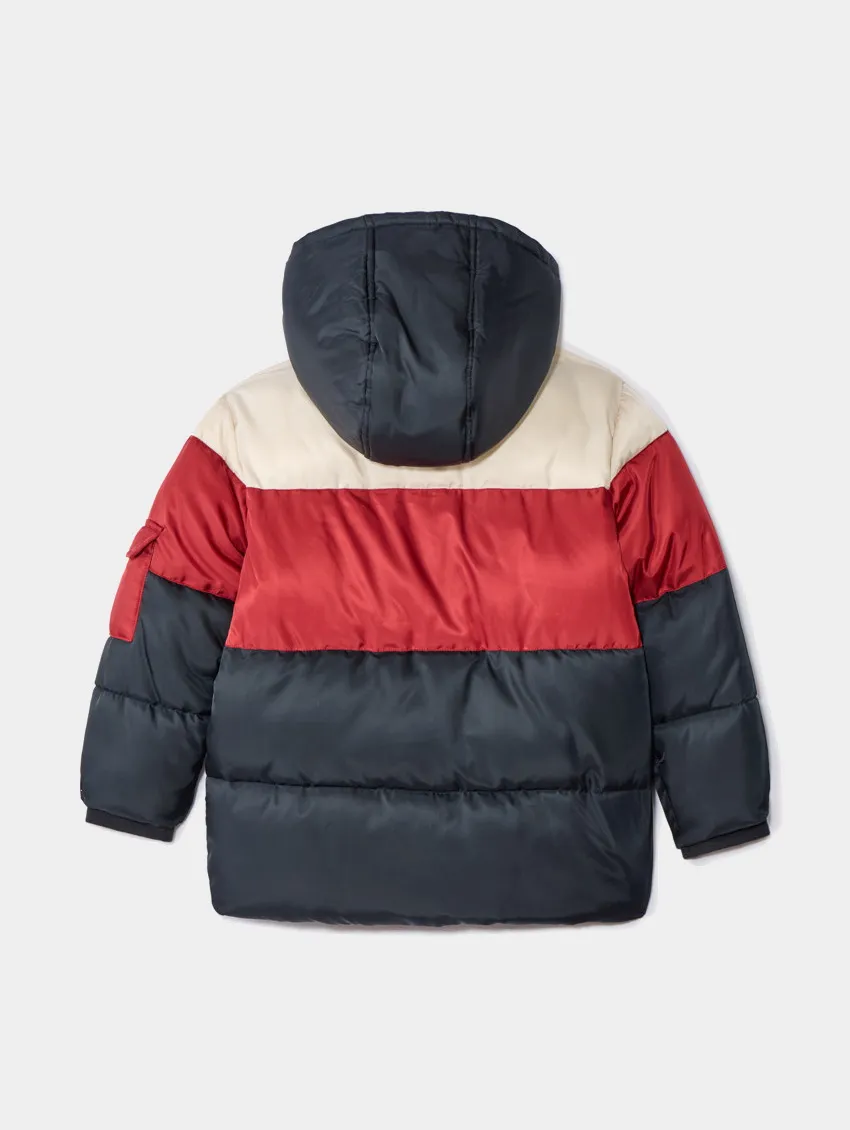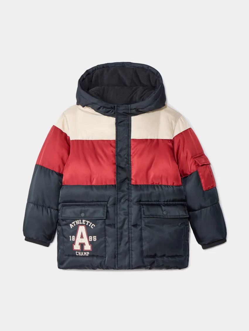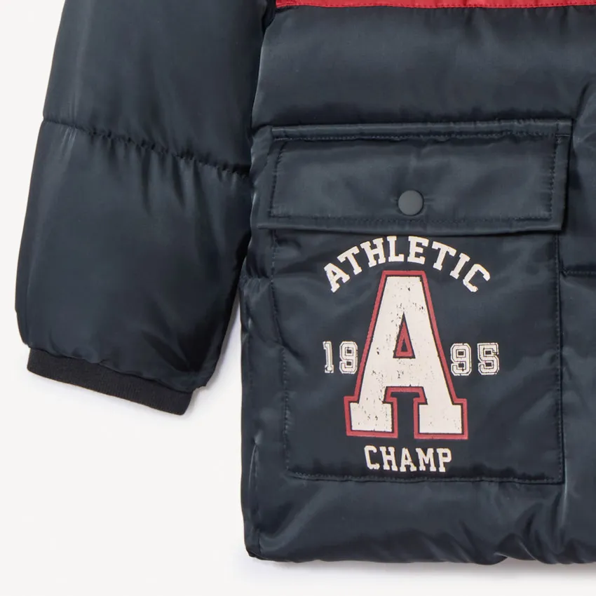 Куртка из водоотталкивающего нейлона с подкладкой из мягкого микрофлиса, обеспечивающей тепло и комфорт. Модель выполнена в трёхцветной гамме с эффектом color block в оттенках кремового, тёмно-синего и красного. Капюшон оснащён защитой от защемления, застёжка спереди — на молнию по всей длине. На передней части расположены два накладных кармана с клапанами на кнопках, один из которых украшен мягким принтом «Athletic Champ». На рукаве дополнительно предусмотрен накладной карман с клапаном на кнопке. Манжеты и нижний край выполнены с эластичной отделкой для удобной посадки.