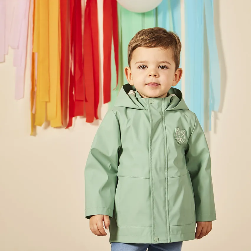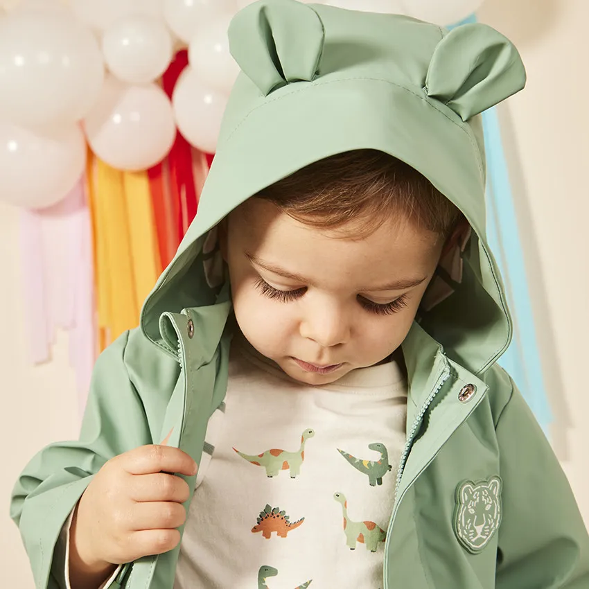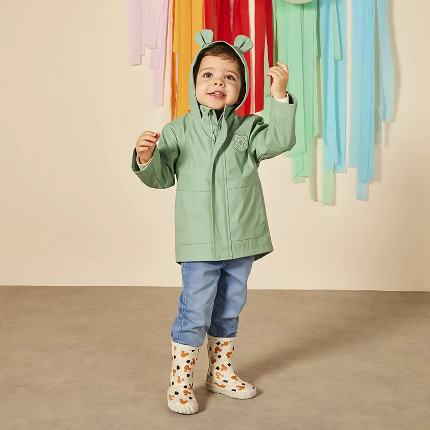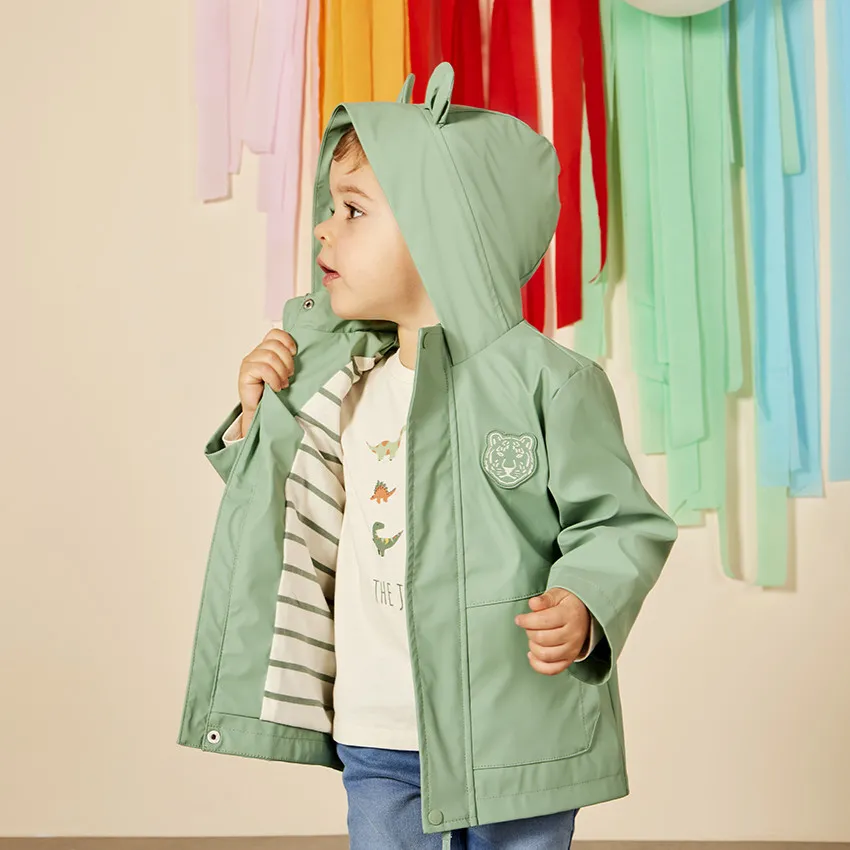 Водоотталкивающий плащ для детей — стильный и практичный плащ в зеленом цвете. Игривый капюшон с 3D тигриными ушками придает модели веселый и оригинальный вид, а воротник-стойка защищает от ветра. Застежка на молнию под кнопкой  спереди обеспечивают дополнительную защиту и удобство. Плащ хорошо защищает шею малыша от ветра. Вырез сверху на спине и разрез внизу, а также задняя панель, длиннее передней, добавляют особый стиль.