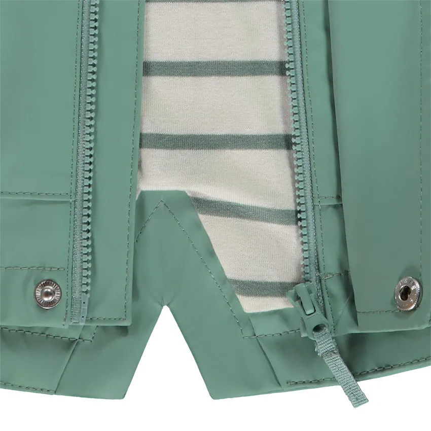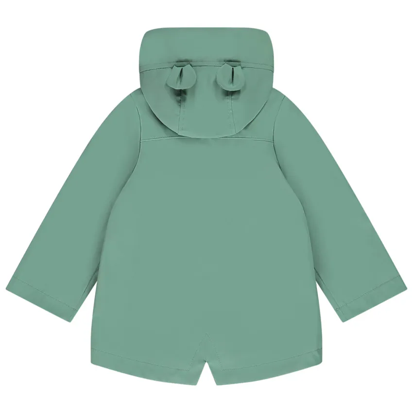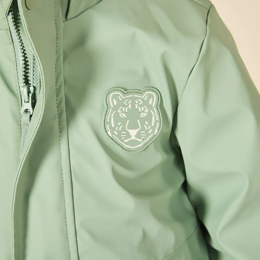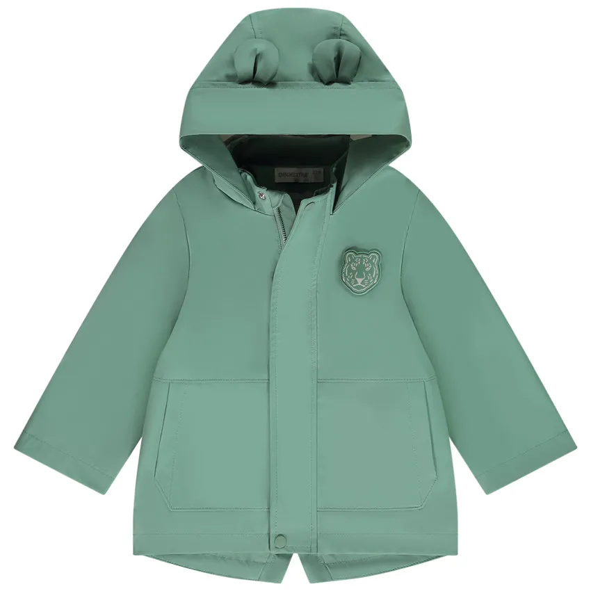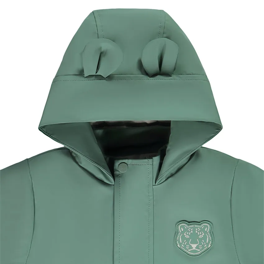Водоотталкивающий плащ для детей — стильный и практичный плащ в зеленом цвете. Игривый капюшон с 3D тигриными ушками придает модели веселый и оригинальный вид, а воротник-стойка защищает от ветра. Застежка на молнию под кнопкой  спереди обеспечивают дополнительную защиту и удобство. Плащ хорошо защищает шею малыша от ветра. Вырез сверху на спине и разрез внизу, а также задняя панель, длиннее передней, добавляют особый стиль.