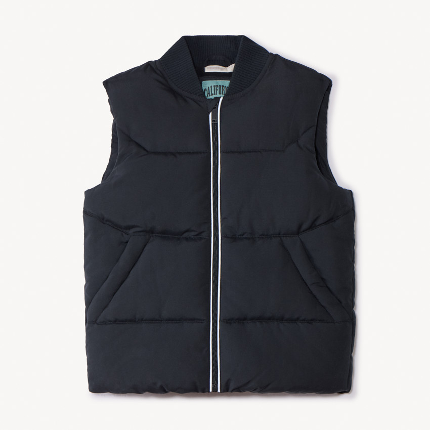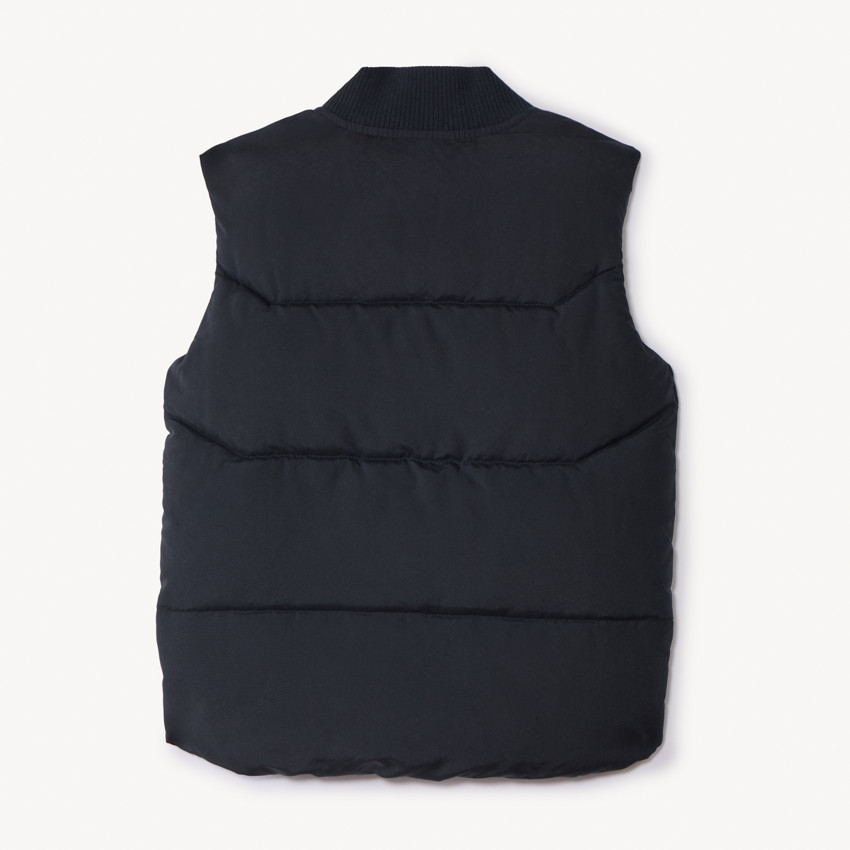 Жилет из стёганой ткани однотонного тёмно-серого цвета. Воротник стойка из трикотажа в рубчик, спереди застёжка-молния с контрастной отделкой и защита для подбородка. Два кармана реглан спереди. Внутренняя подкладка из мягкого микрофлиса. Внутри тканевая именная бирка. Утеплитель выполнен из переработанных материалов.