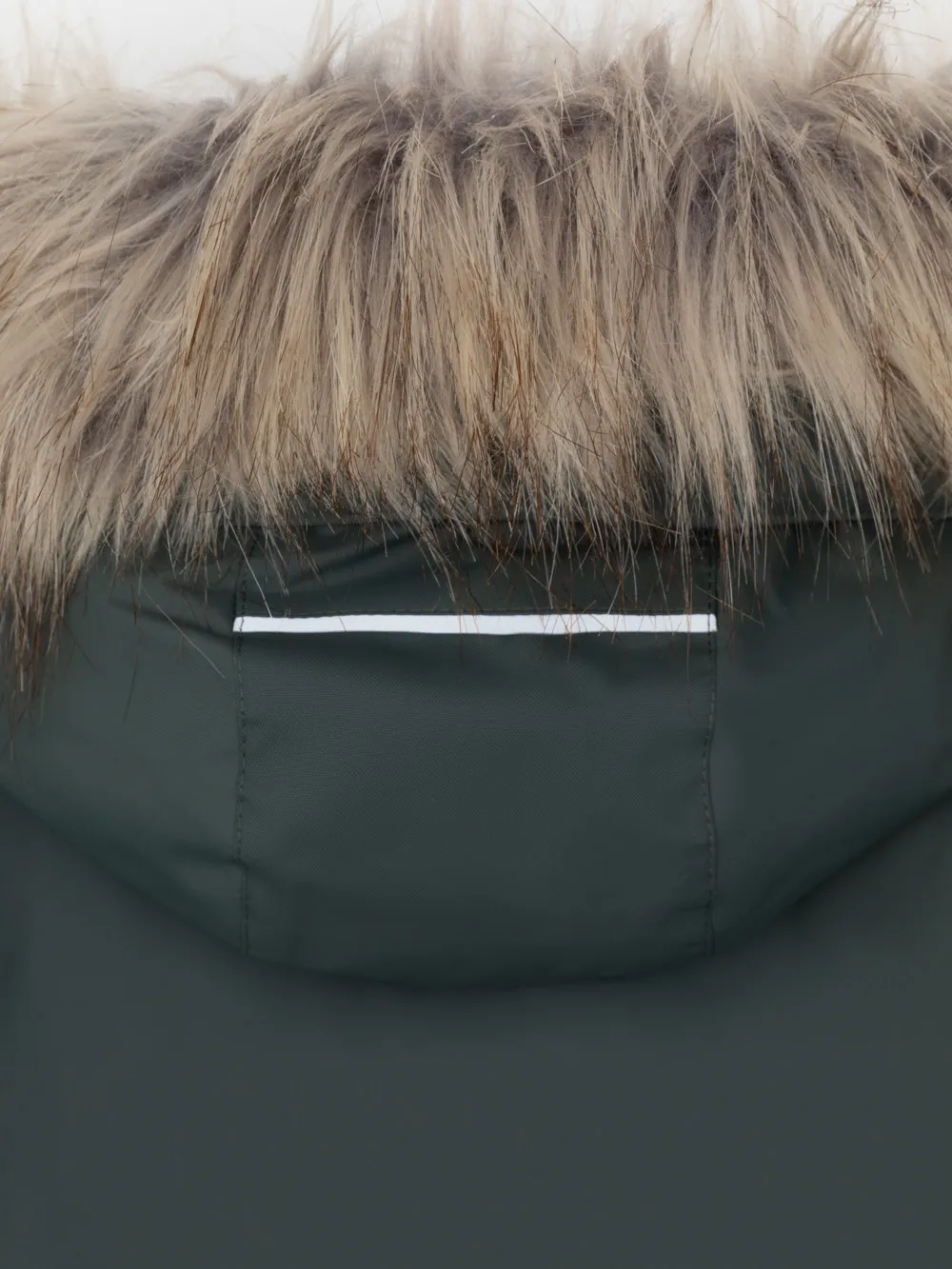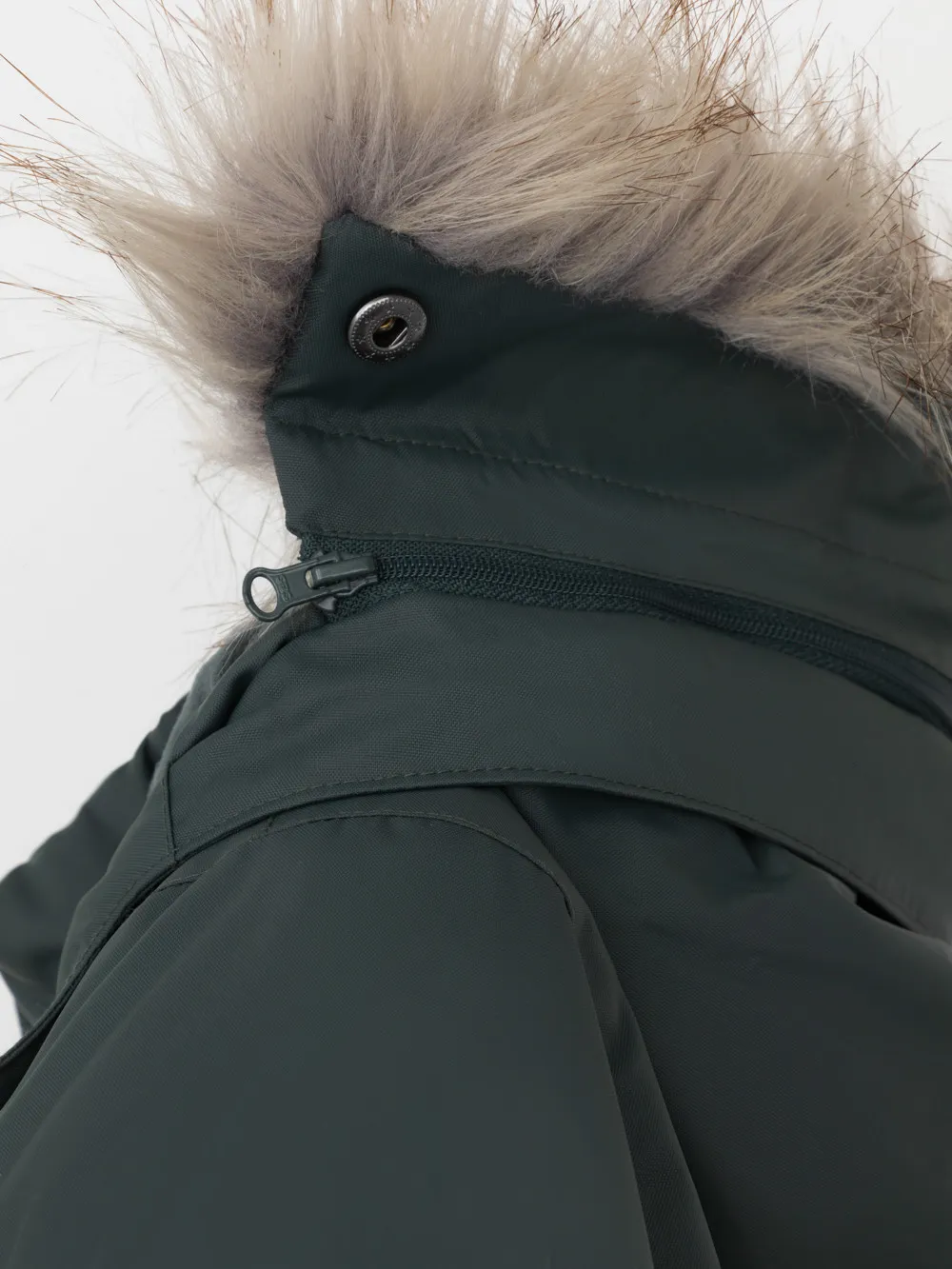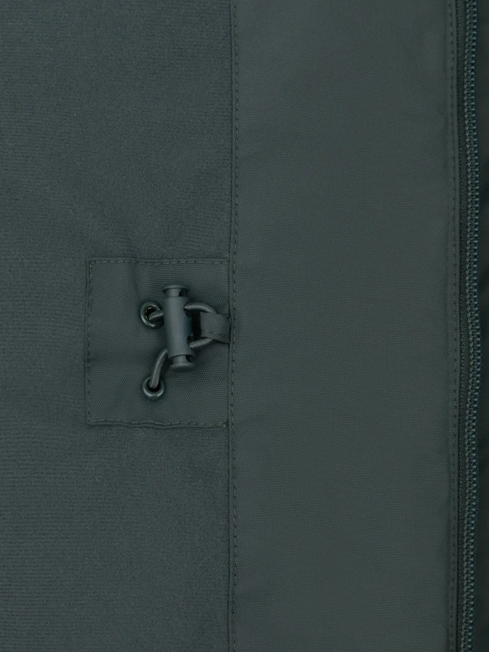 Съёмный капюшон регулируется эластичной утяжкой со стопперами и дополнен отстёгивающейся опушкой из искусственного меха. На рукавах предусмотрены внутренние эластичные манжеты, защищающие от ветра. Для удобства — два вместительных накладных кармана с клапанами. По талии расположена регулируемая утяжка, позволяющая подогнать посадку по фигуре.