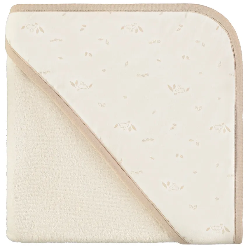 Капюшон выполнен из джерси и украшен рельефным изображением кроликов по всей поверхности, придавая изделию милый и аккуратный вид. Размер полотенца 80 × 80 см, что позволяет удобно укутать малыша после водных процедур.