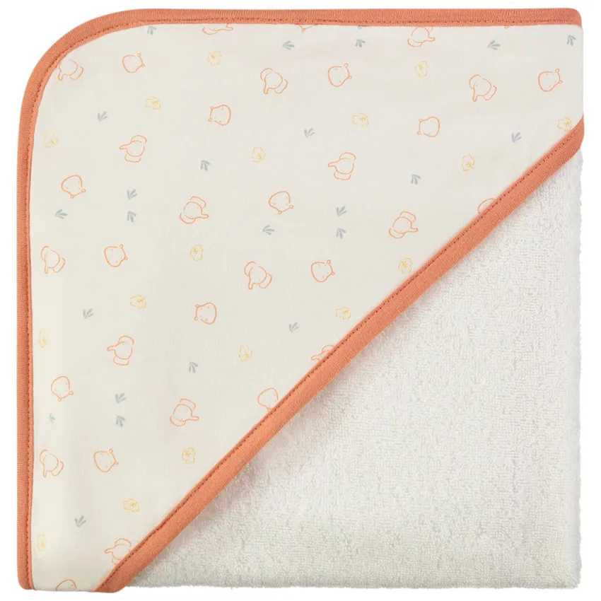 Капюшон выполнен из джерси и украшен рельефным изображением слонят по всей поверхности, придавая изделию милый и аккуратный вид. Размер полотенца 70 × 70 см, что позволяет удобно укутать малыша после водных процедур.