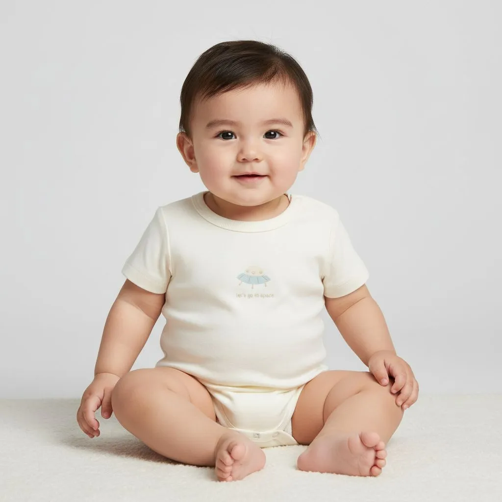 Небольшой аккуратный принт на груди добавляет нежный акцент. Классический круглый вырез и кнопки внизу позволяют быстро и легко переодеть малыша и сменить подгузник.