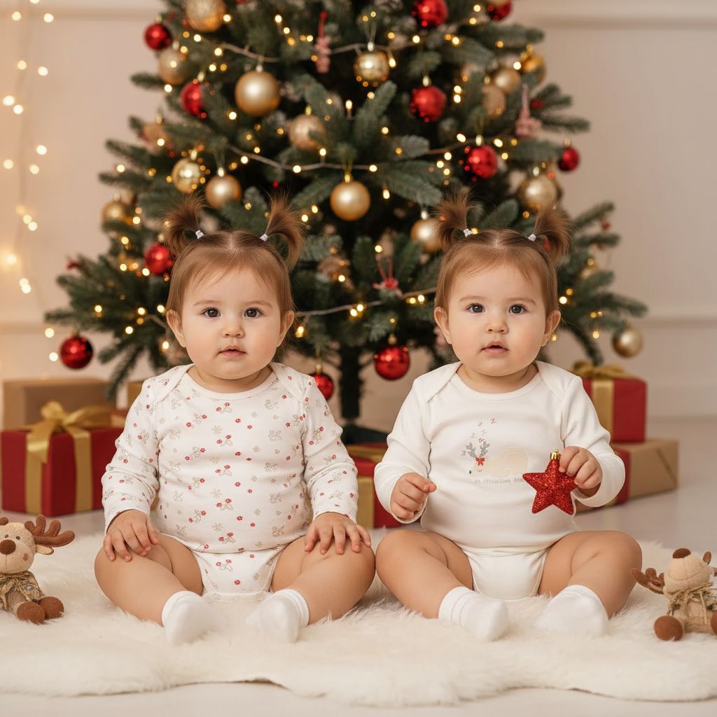 Набор из двух боди с длинными рукавами из мягкого хлопкового трикотажа кремового цвета. Для малышей от 1 до 6 месяцев предусмотрена застёжка на кнопки с запахом «кимоно» и перекрещенным вырезом, для детей от 9 до 36 месяцев — круглый вырез и застёжка на кнопки на плече. Оба варианта имеют удобную застёжку на кнопки внизу. В наборе: боди с праздничным принтом по всей поверхности с блестящими деталями и однотонное боди с рисунком новогоднего оленя спереди и гладкой спинкой.
