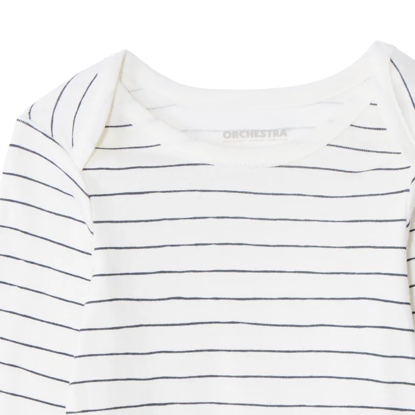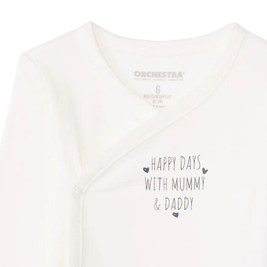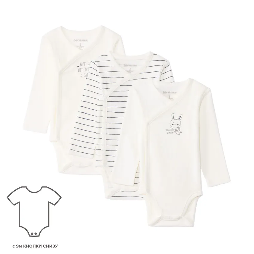 Набор из 3 боди с длинными рукавами, выполненных из мягкого хлопкового трикотажа в рубчик. Все модели в цвете экрю с разными принтами и рисунками. В зависимости от размера предусмотрены разные типы застёжек: для малышей до 6 месяцев — застёжка на кнопках с запахом и перекрёстным воротом, от 9 до 36 месяцев — круглый вырез и удобные плечевые разрезы. Все боди оснащены кнопками в шаговом шве для лёгкого переодевания.