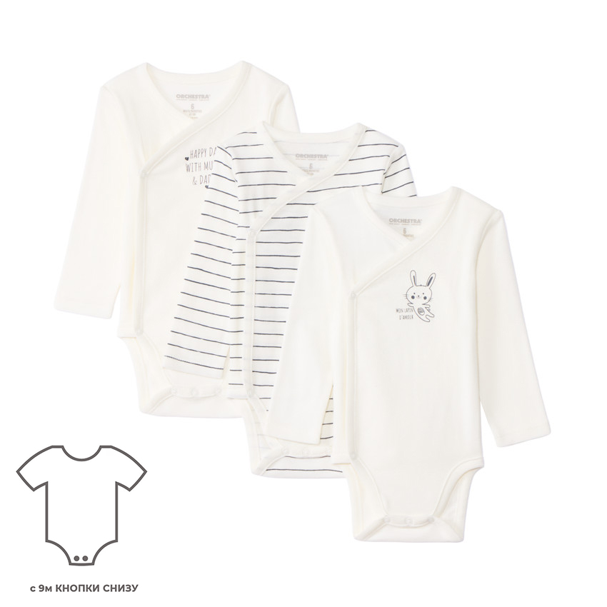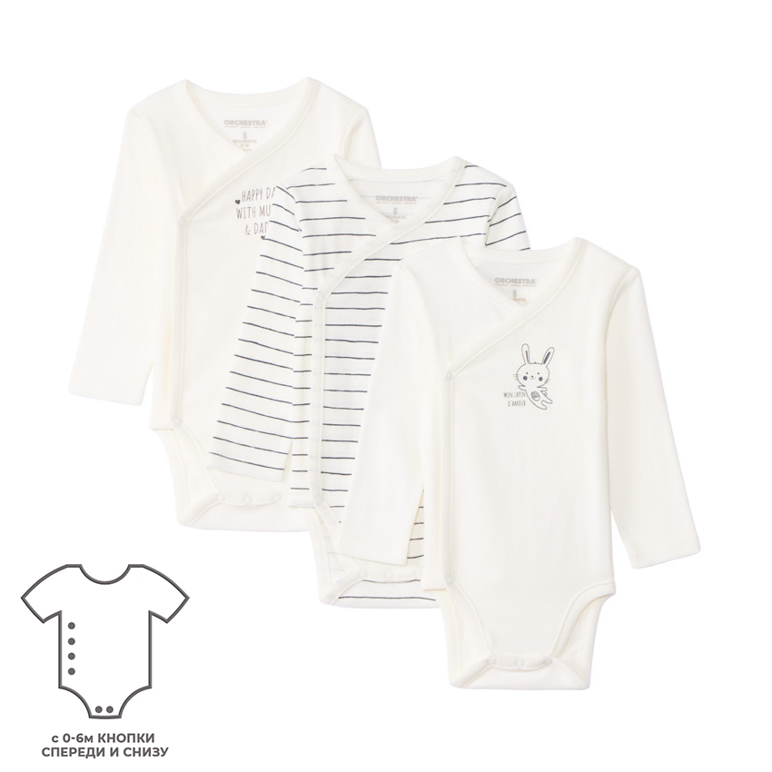 Набор из 3 боди с длинными рукавами, выполненных из мягкого хлопкового трикотажа в рубчик. Все модели в цвете экрю с разными принтами и рисунками. В зависимости от размера предусмотрены разные типы застёжек: для малышей до 6 месяцев — застёжка на кнопках с запахом и перекрёстным воротом, от 9 до 36 месяцев — круглый вырез и удобные плечевые разрезы. Все боди оснащены кнопками в шаговом шве для лёгкого переодевания.