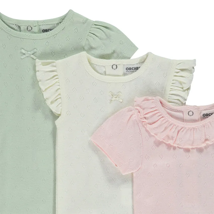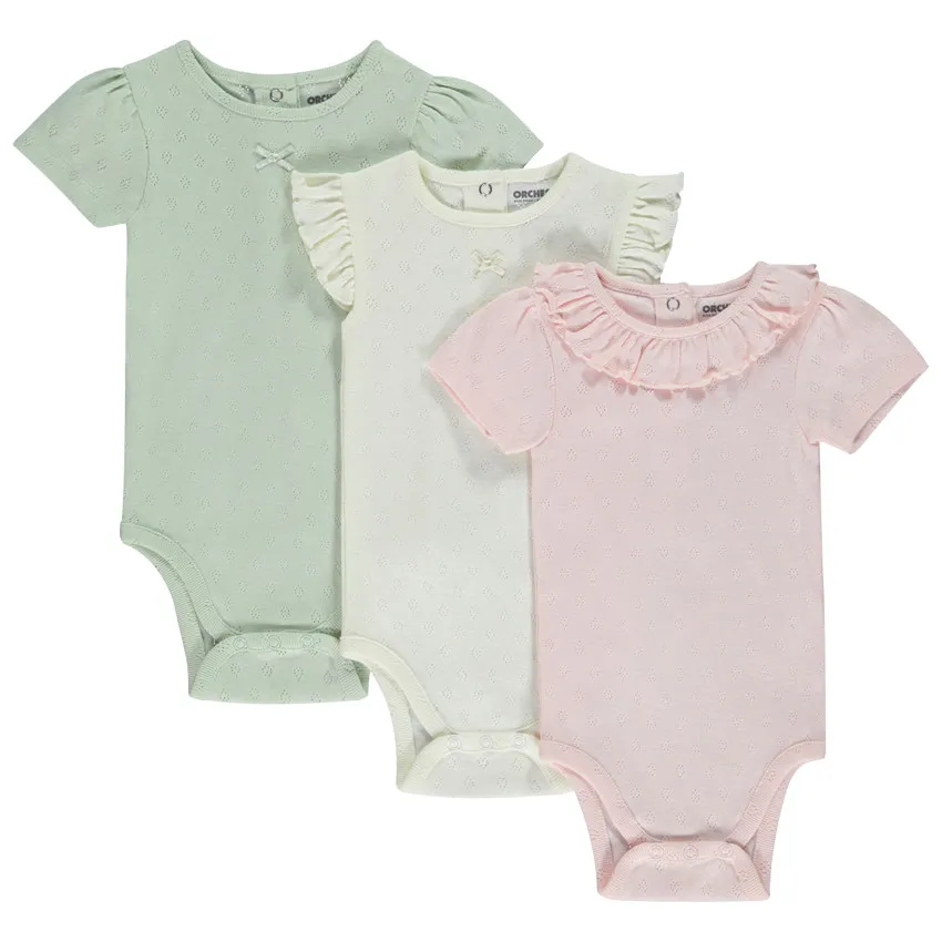 Набор из 3 боди для малышки с коротким рукавом выполнен из ткани пуантьевого плетения, которая отличается лёгкостью, мягкостью и хорошей воздухопроницаемостью. Каждое боди разные по Набор состоит из трёх разных боди. Каждое боди имеет уникальный дизайн: одно — с рукавами-фонариками, второе — с оборками на рукавах, третье — с оборками на воротнике.