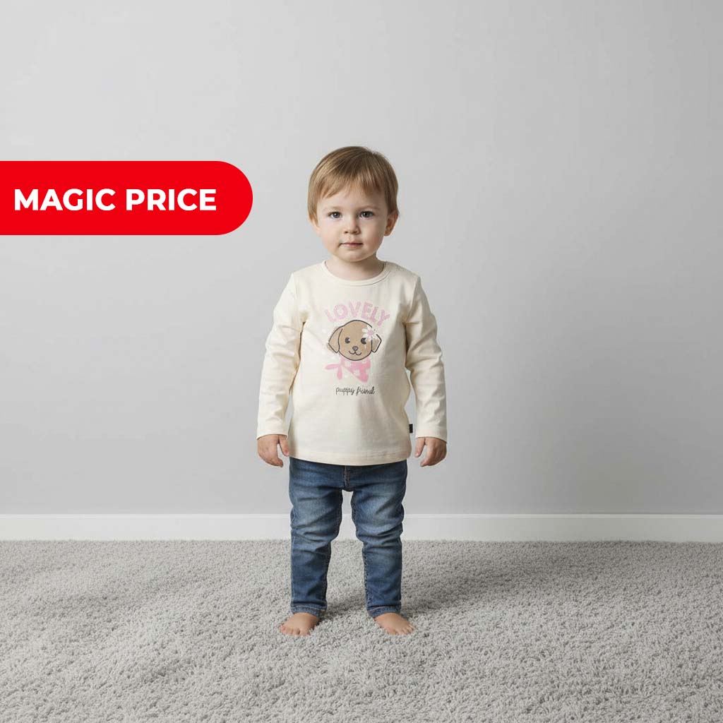 По центру расположен милый принт с блёстками, который придаёт футболке очаровательный акцент и делает образ более нарядным. Удобный крой не сковывает движений, футболка отлично подойдёт для прогулок, детского сада и уютных семейных выходов