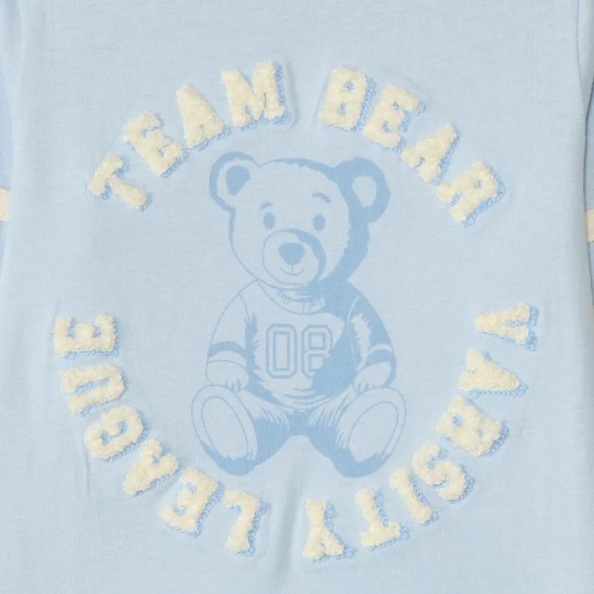 Модель выполнена из натурального материала 100% хлопок, который хорошо пропускает воздух, приятен к телу и подходит для чувствительной кожи. По центру расположен принт с плюшевым мишкой, а рядом с ним — аккуратный вышитый принт, добавляющий образу нежный декоративный акцент.