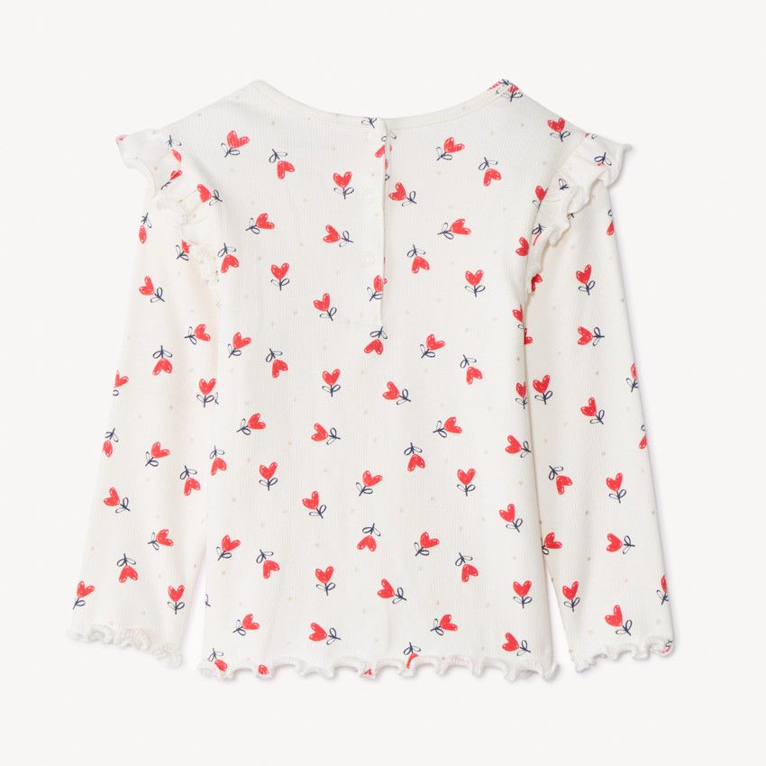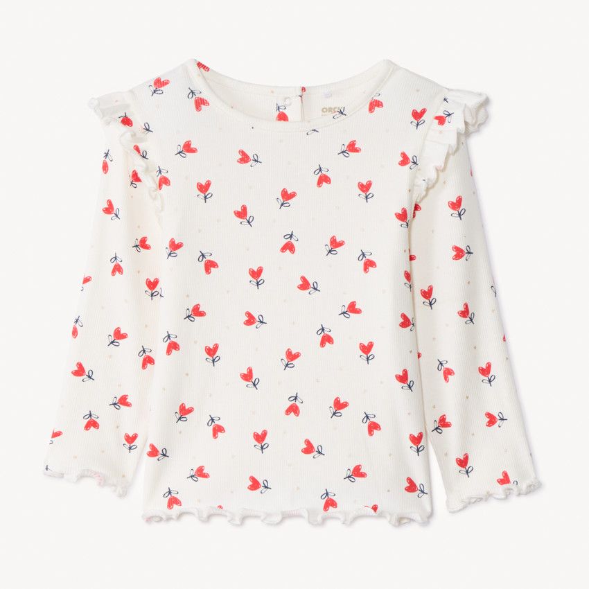 Мягкая и комфортная футболка с длинным рукавом для малышки, украшенная принтом из сердечек с блестками по всей поверхности. На плече — милые рюши, которые добавляют нежности и очарования.