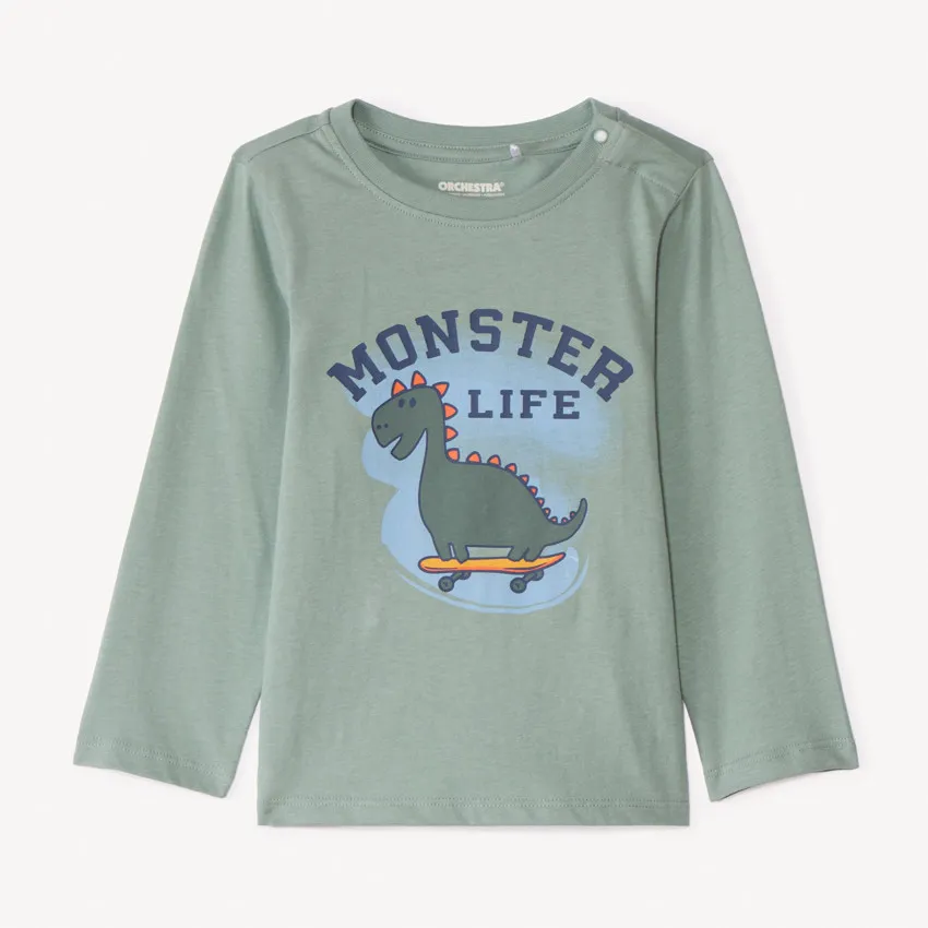 Футболка с длинными рукавами из мягкого трикотажа однотонного цвета. Круглый вырез, застёжка на кнопки на плече для удобства надевания. Спереди декоративный принт с ярким рисунком, спинка однотонная, что создаёт гармоничный и простой образ.