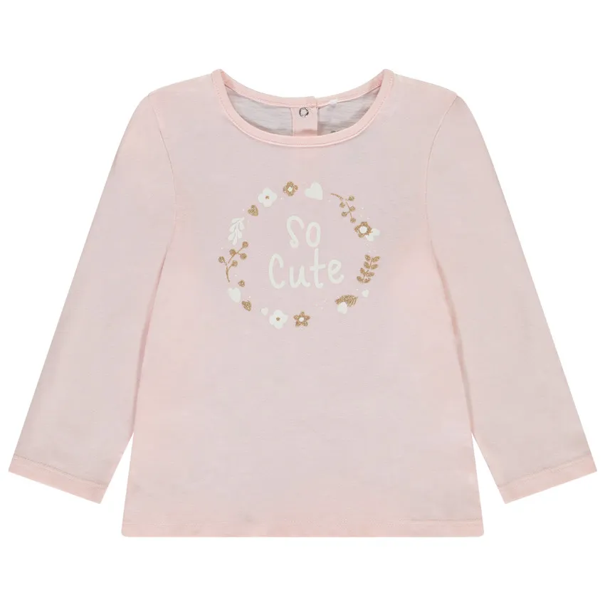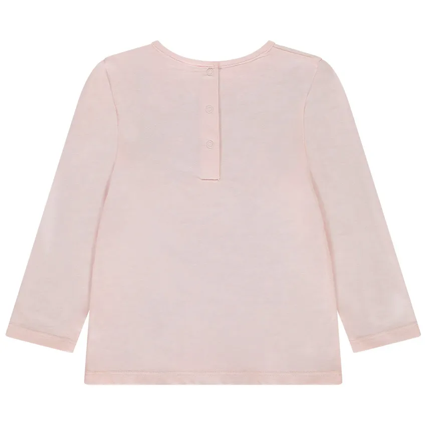 Футболка с длинными рукавами из мягкого джерси однотонного цвета. Модель с круглым вырезом горловины и удобной застёжкой на пуговицы сзади. Спереди — декоративный рисунок с блестящими деталями, спинка однотонная. Отличный вариант для повседневных образов с лёгким акцентом на нарядность.