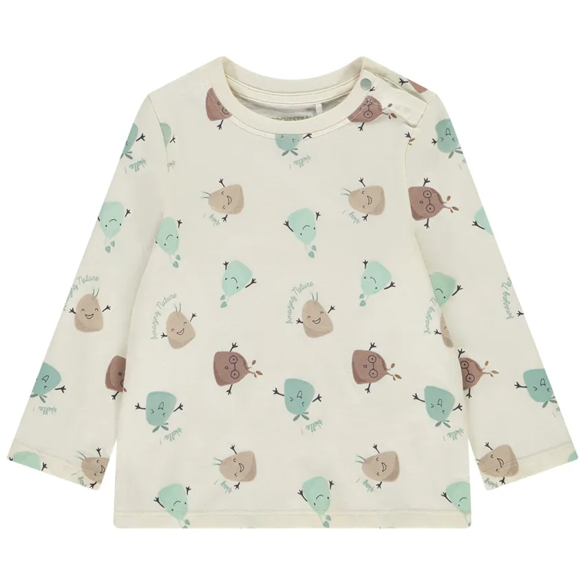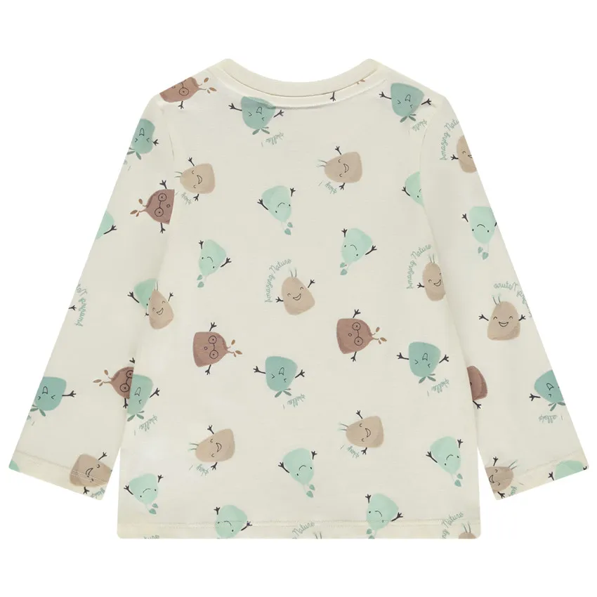 Футболка с длинными рукавами из мягкого джерси цвета экрю. Украшена ярким принтом с растительными существами по всей поверхности. Модель с круглым вырезом горловины и удобной застёжкой-кнопкой на плече. Отличный вариант для комфортного и стильного повседневного образа.