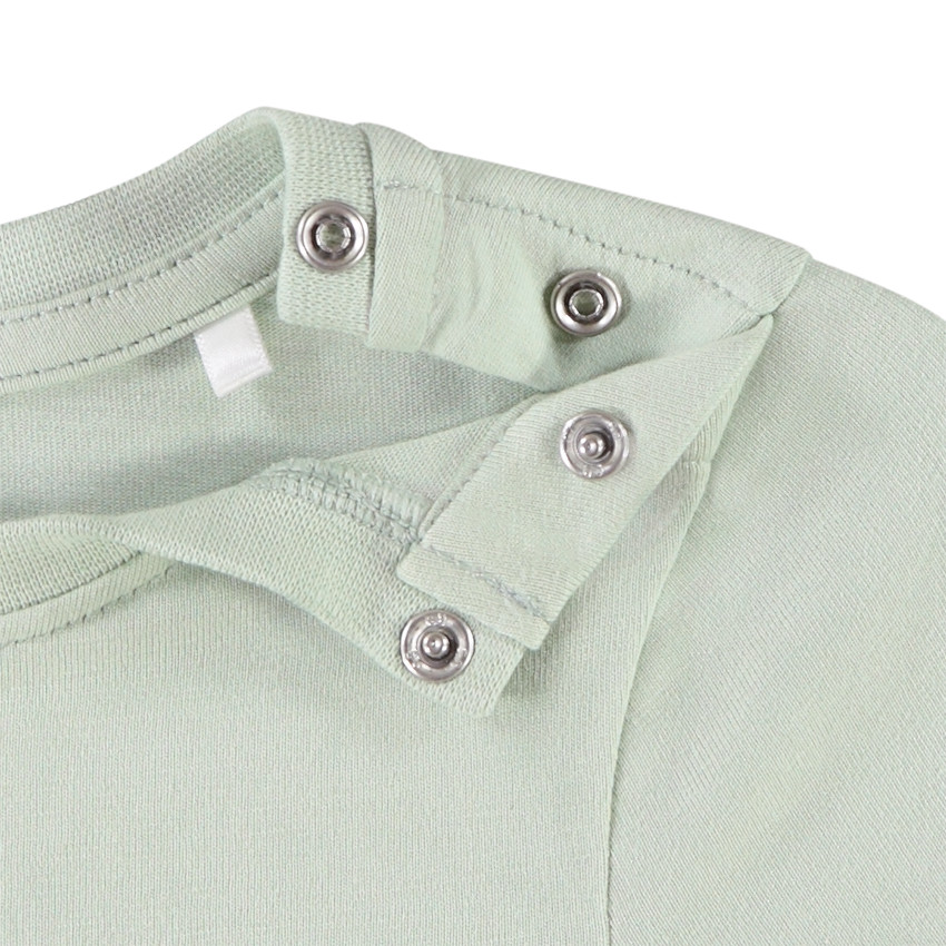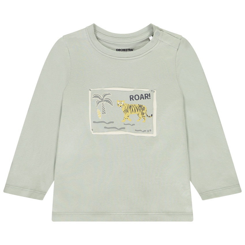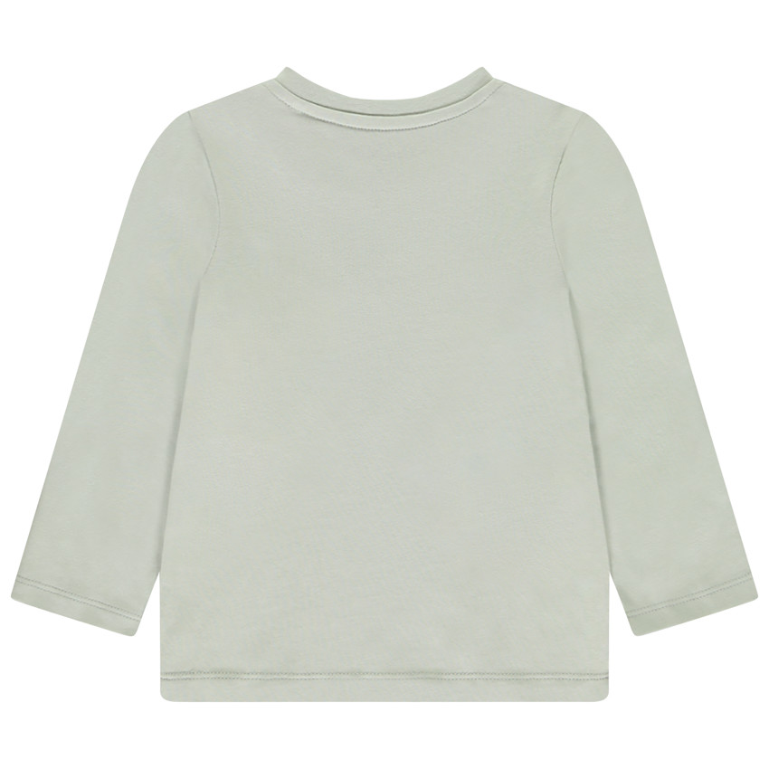 Лонгслив из мягкого трикотажа в однотонном цвете. Модель выполнена с круглым вырезом, украшенным контрастной красной отделкой. На плече — удобная застёжка на кнопках для лёгкого переодевания. Передняя часть оформлена фантазийным принтом с объёмными puff-деталями, добавляющими выразительности образу. Спинка полностью однотонная.