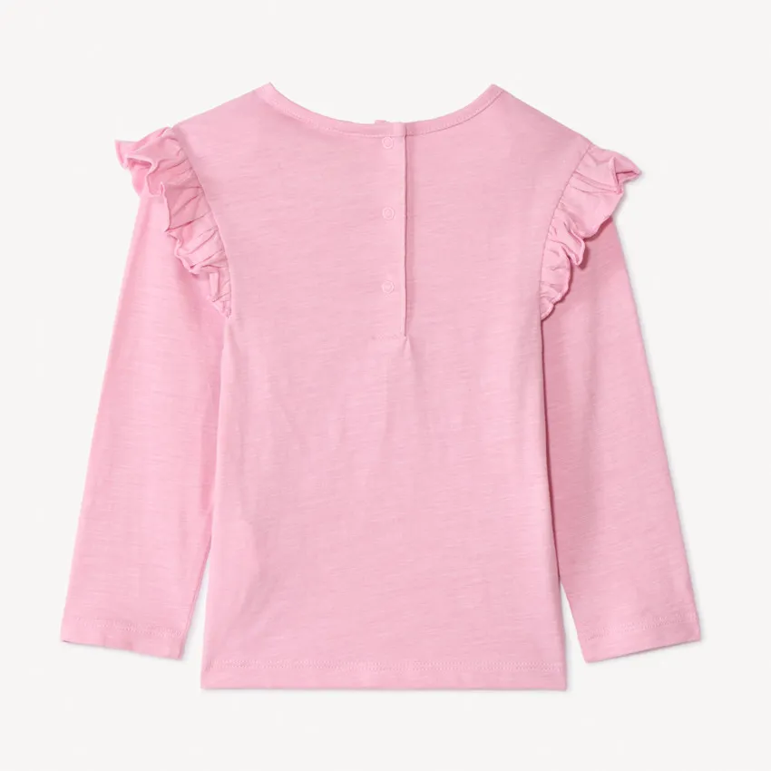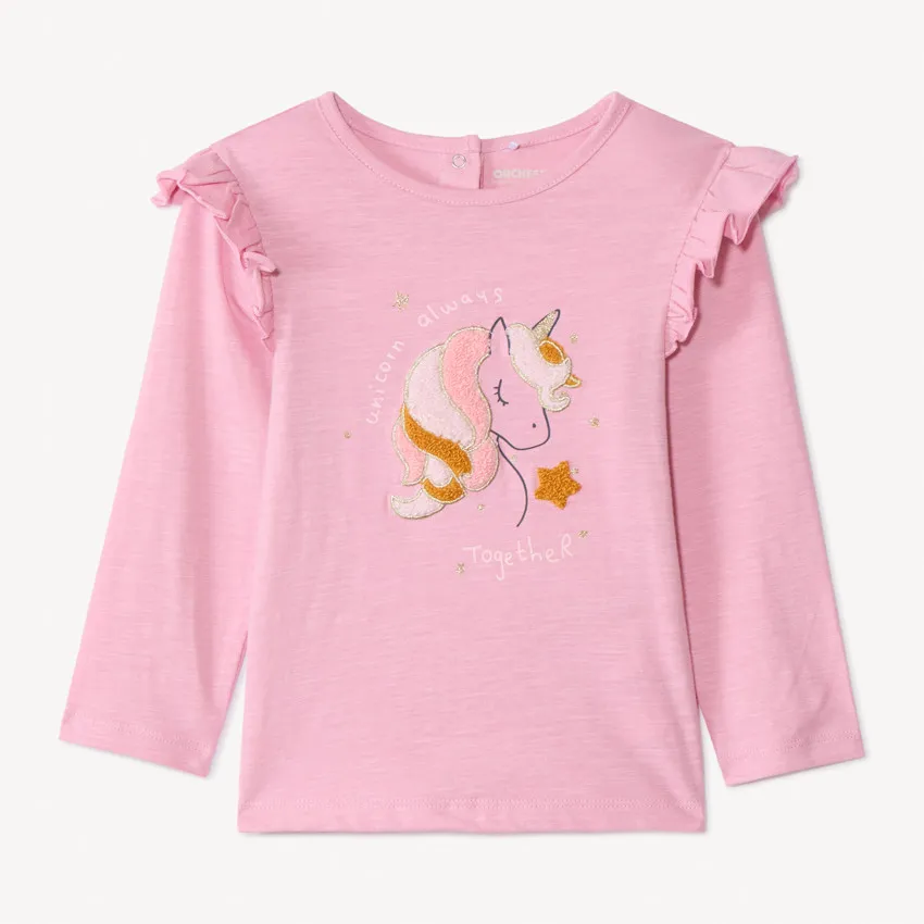 Детская кофта с длинным рукавом выполнена из мягкого трикотажа в нежно-розовом цвете, приятного к коже и удобного для повседневной носки. На груди расположен крупный рисунок единорога с объёмной вышивкой и блестящими деталями, создающий волшебный и нарядный акцент. Романтичные воланчики на проймах добавляют модели нежности и делают её особенно привлекательной для маленьких модниц. Круглый вырез и застёжка-кнопка на спинке обеспечивают лёгкое и удобное переодевание. Отличный выбор для сада, прогулок и домашних игр — мягкая, красивая и по-детски сказочная.
