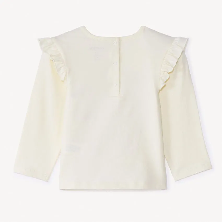 На передней части расположено милое изображение зайца, которое придаёт образу очаровательный акцент. Оборки на плечах добавляют модели нежности и делают дизайн более выразительным. Застёжки на спине облегчают надевание и переодевание ребёнка. Длинные рукава делают футболку практичной для прохладной погоды.